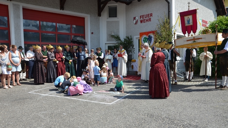 Der erste Altar beim Feuerwehrhaus wurde heuer neu errichtet. Als Bild dient das bunte Altartuch, das in Eidenberg bei der Erstkommunion den Hochaltar ziert. So soll die Verbindung von Erstkommunion und Fronleichnam besonders verdeutlicht werden. Dieser Altar wurde als Kinderstation gestaltet, wo das Evangelium der Brotvermehrung in einer Kinderbibel-Version vorgelesen wurde. Anschließend malten die Kinder mit Straßenkreiden ein Bild zum Thema.