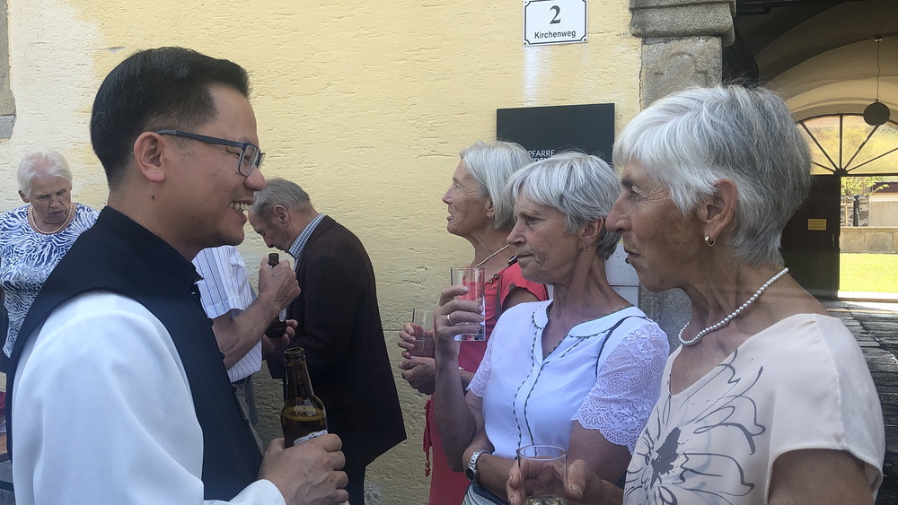 P. Josaphat wird zunächst Urlaub machen und kehrt dann ins Stift Schlierbach zurück, wo er die Pfarren Grünburg, Losenstein und noch weitere Pfarren zugeteilt bekommt. Ferdinand Aichinger und Thomas Schwierz bedankten P. Josaphat im Namen der Pfarrgemeinde und überreichten ein kleines Präsent. Im Anschluss an die Messe war eine Agape vorbereitet.