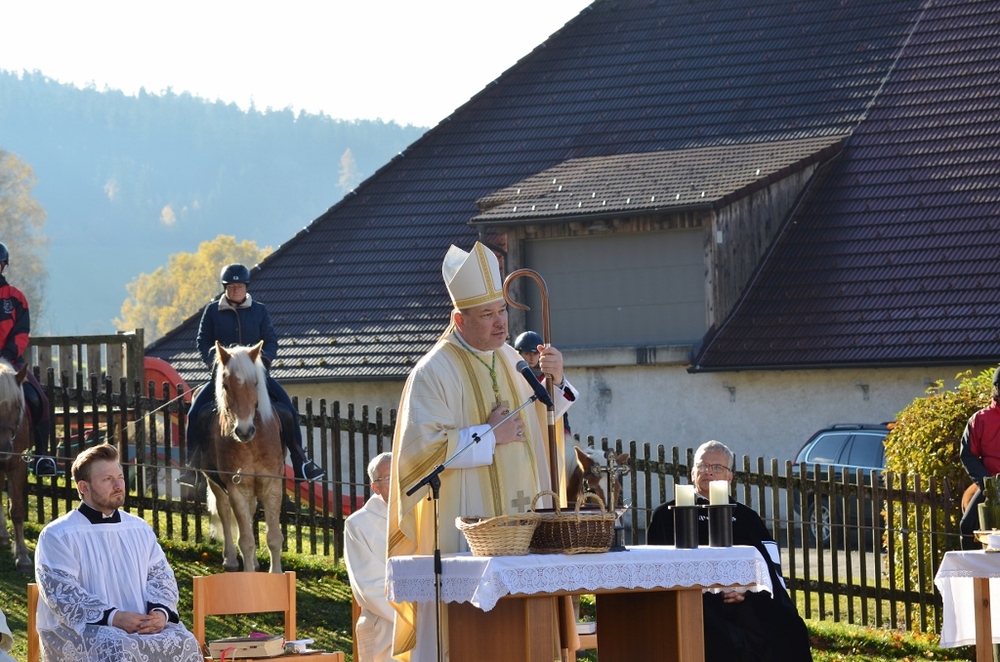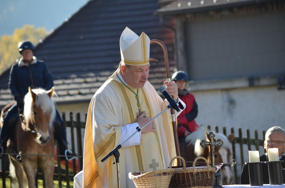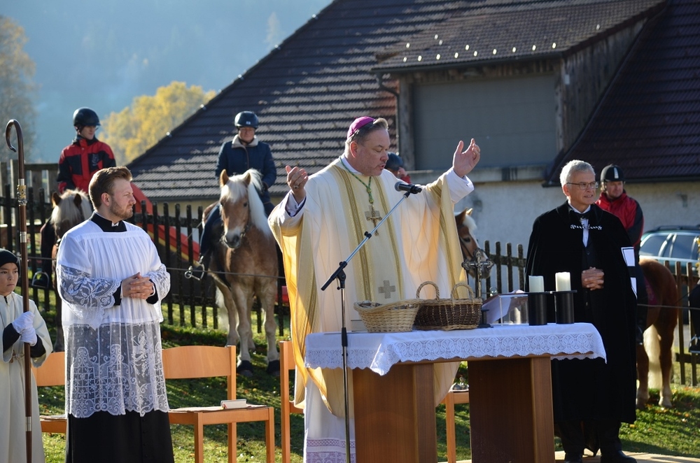Am Ende des Festgottesdienstes segnete Hochmeister Frank Brote, die von den Feuerwehrbuben an die Pferde verteilt wurden. Der Hochmeister ging durch die Reihen der Pferde, um sie und ihre Reiter mit Weihwasser zu segnen.