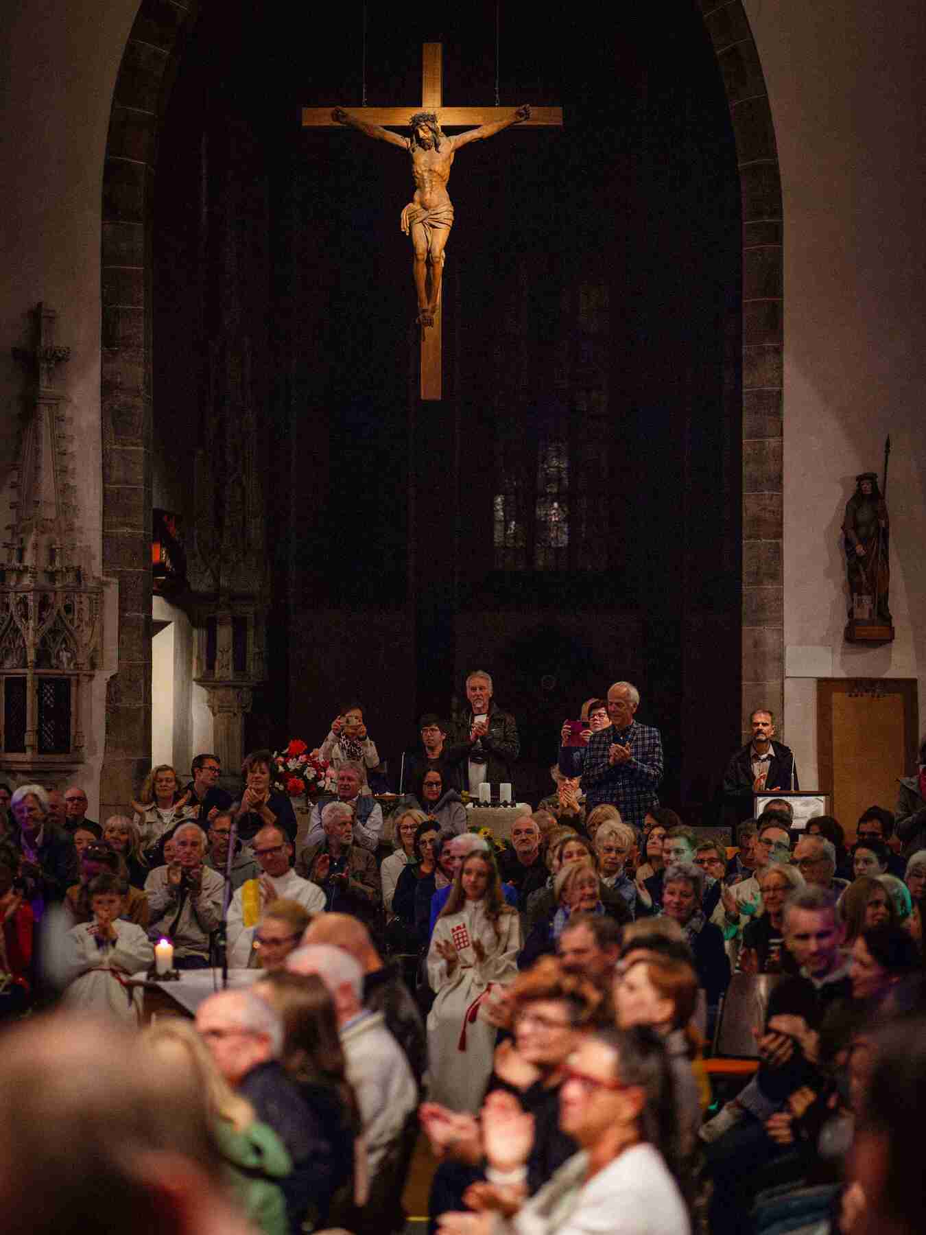 Der Kirchenraum war gedreht, Band und Chor waren vor der Orgel gruppiert, der Altar fand sich im Zentrum der Kirche und die Mitfeiernden nahmen auf diese Weise sowohl das liturgische Geschehen als auch die Musik in ihre Mitte. Es war eine gelungene Symbiose von Gottesdienst und Musik, in der Pfarrleiter Harald Prinz einzelne Songs auch inhaltlich aufmachte und sie im Hinblick auf Menschsein und Christsein heute interpretierte.