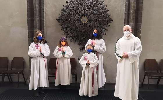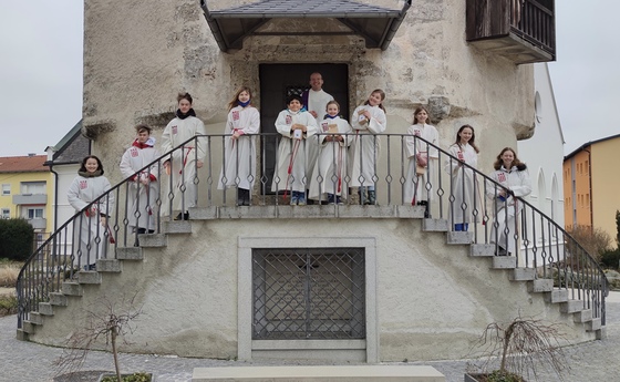 Gleich beim ersten Familiengottesdienst der Fastenzeit stellten sich viele Kinder zum Ministrieren ein. Im Anschluss posierten sie trotz niedriger Temperaturen vor dem Karner für ein Foto - da durften auch die bunten Masken kurz weichen.