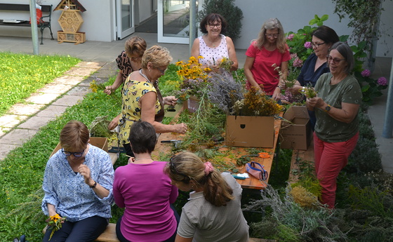 Im Vorfeld des Festes Mariä Himmelfahrt, dessen Kräuterweihe unsere frühere Pastoralassistentin Christine Leonhartsberger vornahm, trafen sich mehrere Frauen der Ennser Goldhaubengruppe im Atrium der Pfarre, um wunderschöne und wohlriechende Kräuterbüschel für den Festgottesdienst zu binden.