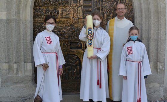 Die Karwoche sowie die Osterliturgie konnten heuer wieder mit vertrauten und ansprechenden Formen in gemeinsamen Gottesdiensten gefeiert werden. Unser Bild zeigt einen Schnappschuss kurz vor der Ostersonntagsfeier mit der wunderschönen Osterkerze von Marie und Ilse Mayrhofer.