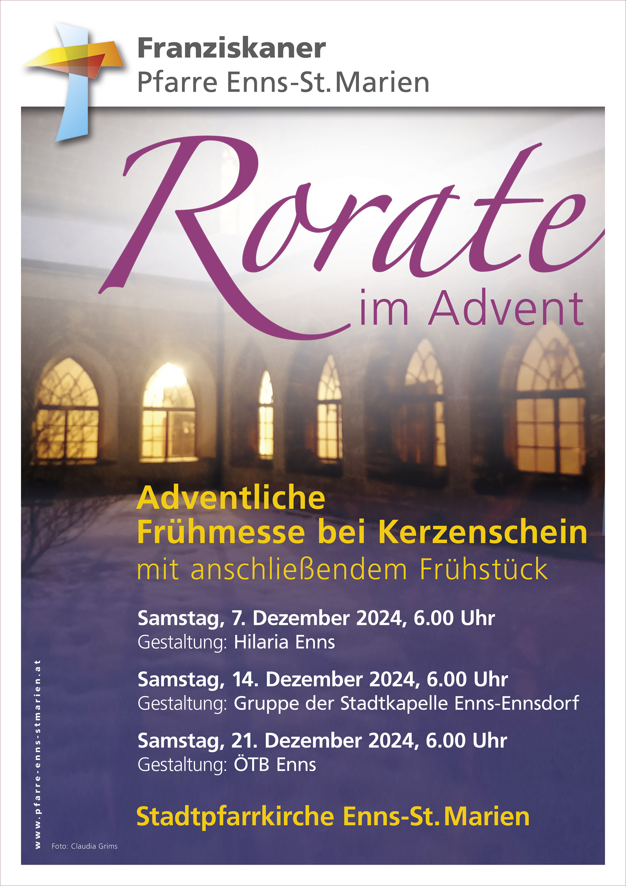 Samstag, 6.12., 13.12. u. 20.12 um 6.00 Uhr, Stadtpfarrkirche Enns-St. Marien; Gestaltung siehe Flyer. Jeweils mit anschließendem gemeinsamem Frühstück.