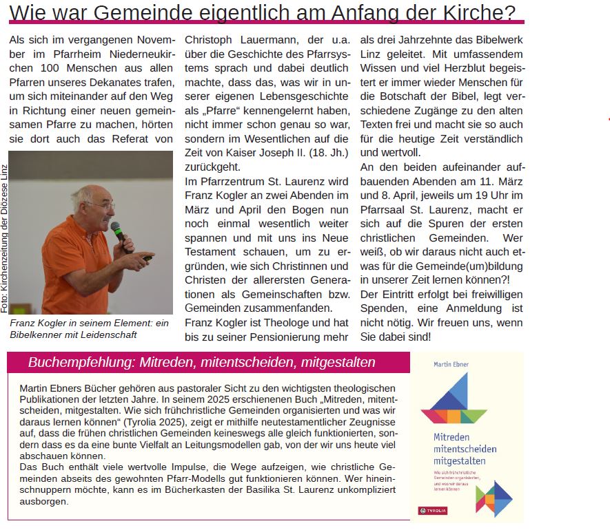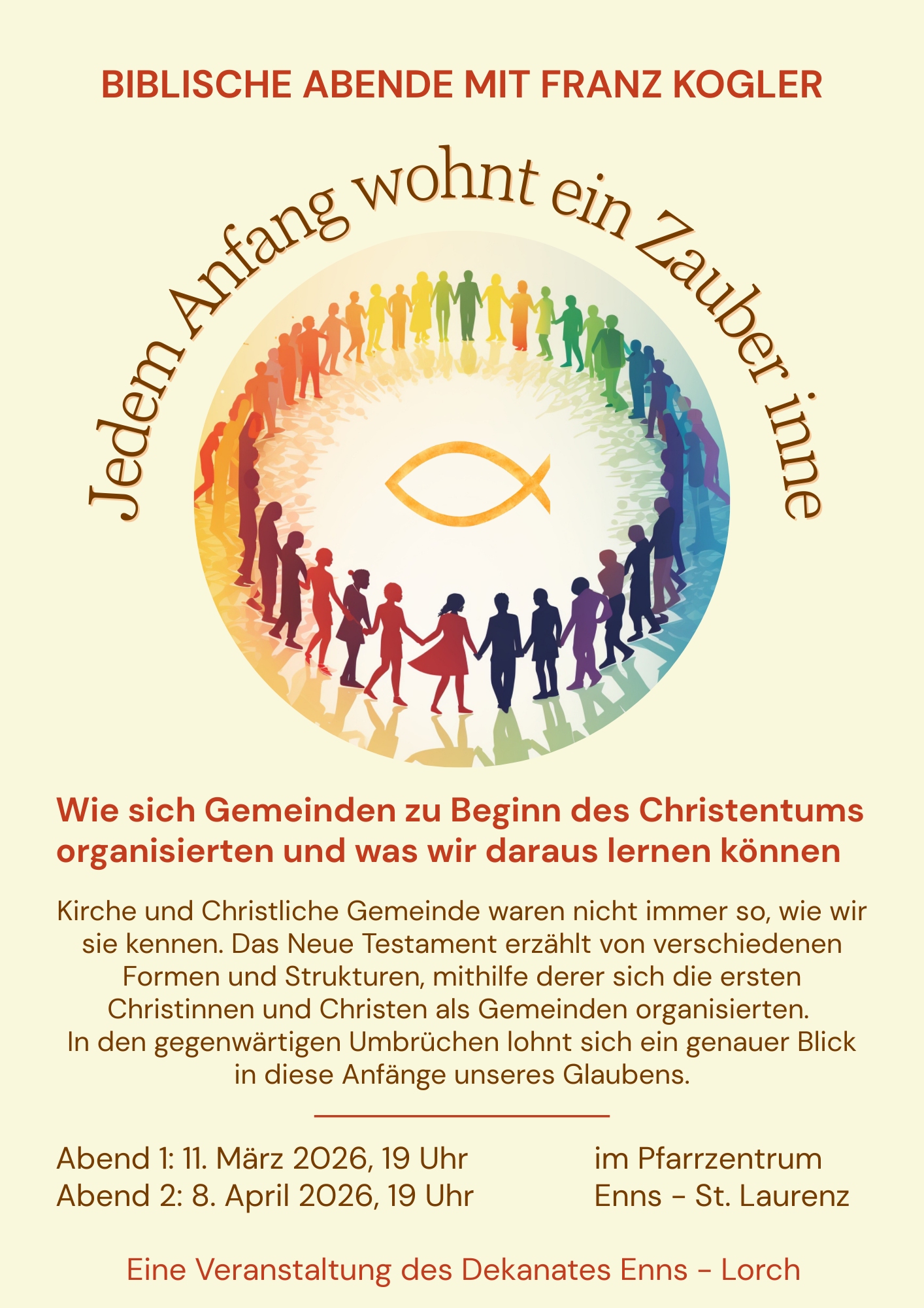 2. Biblischer Abend mit Franz Kogler: 8. 4. 26, 19.00 Uhr, Pfarrzentrum St. Laurenz. Eine Veranstaltung des Dekanates Enns-Lorch. Die beiden Abende bauen aufeinander auf. Es wäre günstig, beide Abende zu besuchen.