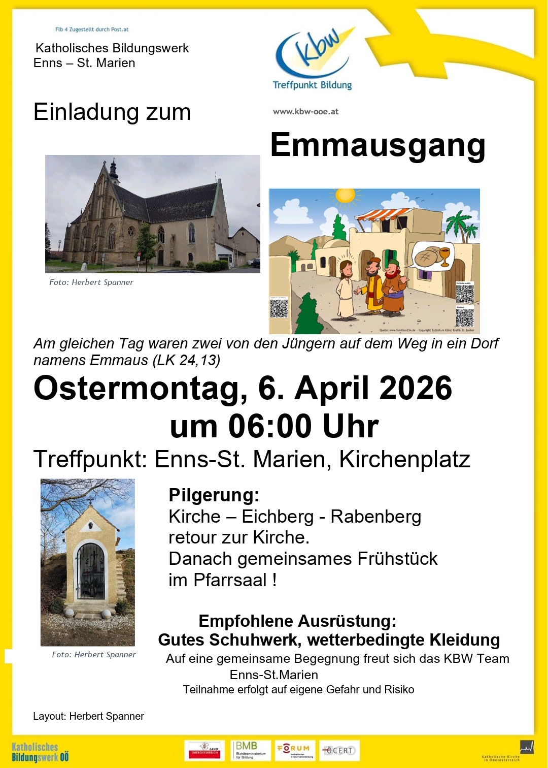 06:00 Uhr | Enns-St. Marien, Enns Emmausgang des KBW am Ostermontag Start Kirchenplatz Enns-St. Marien Montag 06.04.