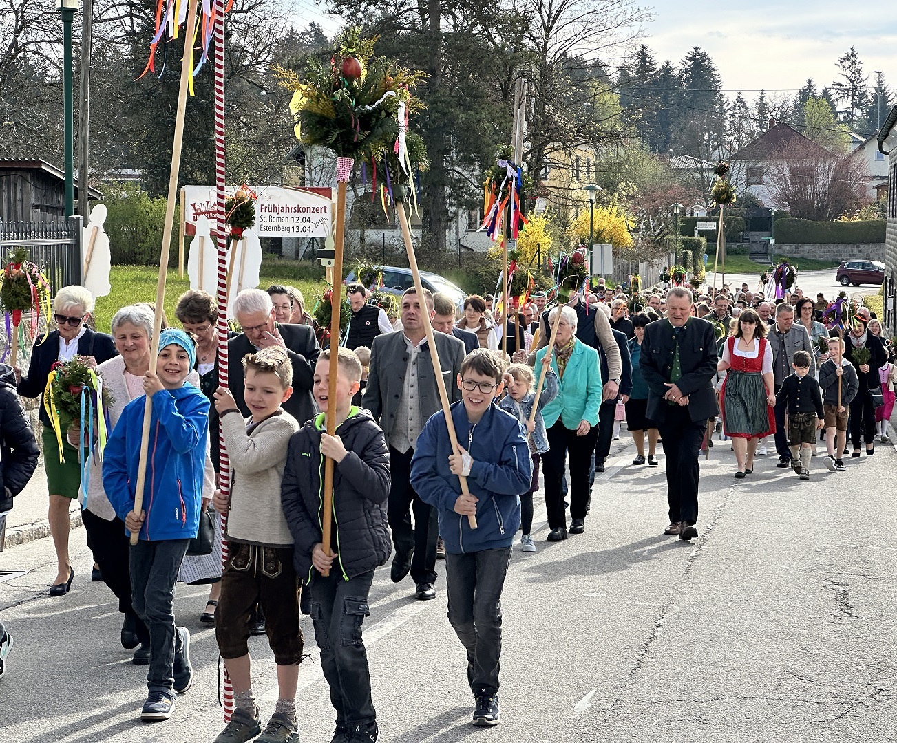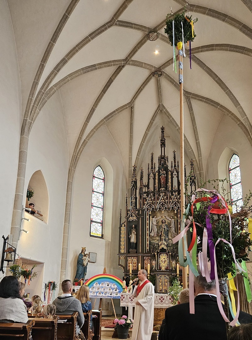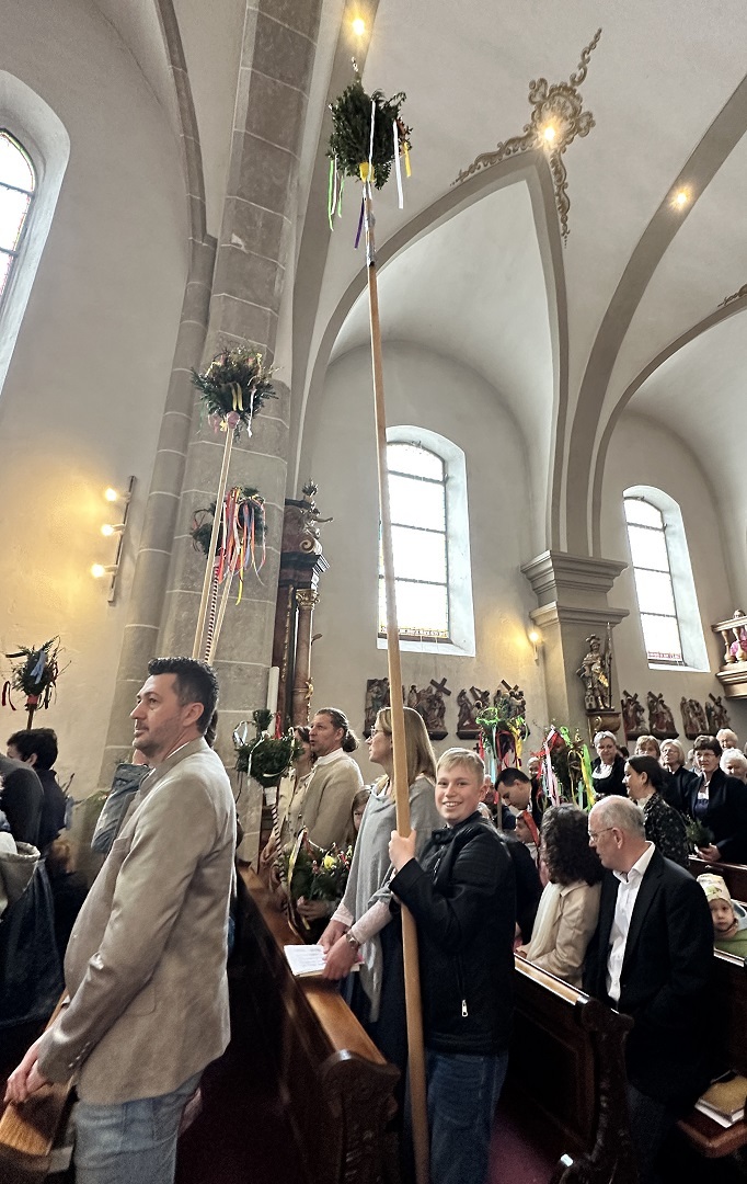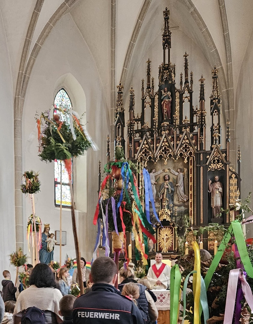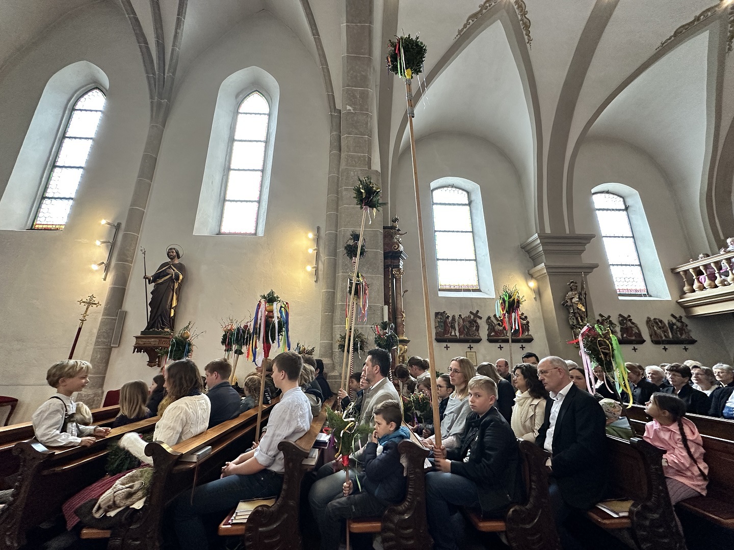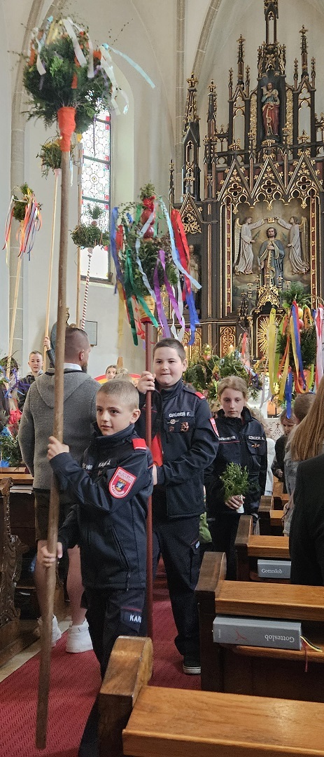 Das erste Mal, dass der Palmsonntag als Familienmesse gefeiert wurde, und dieses erste Mal wurde sehr gut angenommen. Durch ein kindgerechtes Frage- und Antwortspiel wurden unsere Kindergarten- und Schulkinder auf die Karwoche und die folgenden Osterfeiertage eingestimmt. Palmbuschen in allen Höhen waren im Kirchenschiff zu bestaunen, und die am Palmsonntag weggelassene Passionsgeschichte wurde, wie jedes Jahr, auch am Karfreitag aufgeführt.