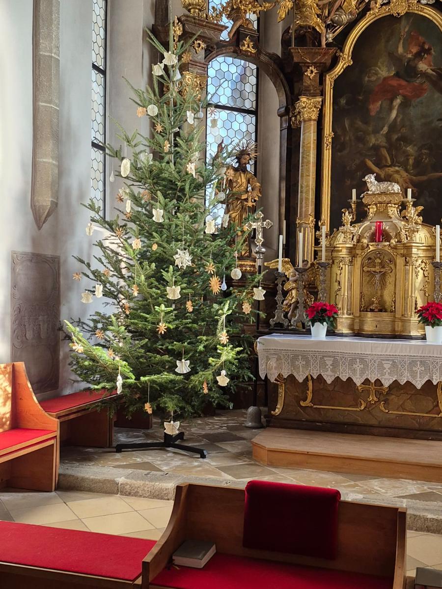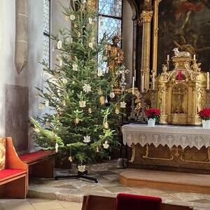 Vier Männer und drei Frauen waren beim Schmücken im Einsatz. Sie haben drei kleine und einen großen Christbaum in der Kirche aufgestellt und mit Strohsternen und Engeln aufgeputzt. Am Seitenaltar haben sie wieder die große Krippe aufgebaut.