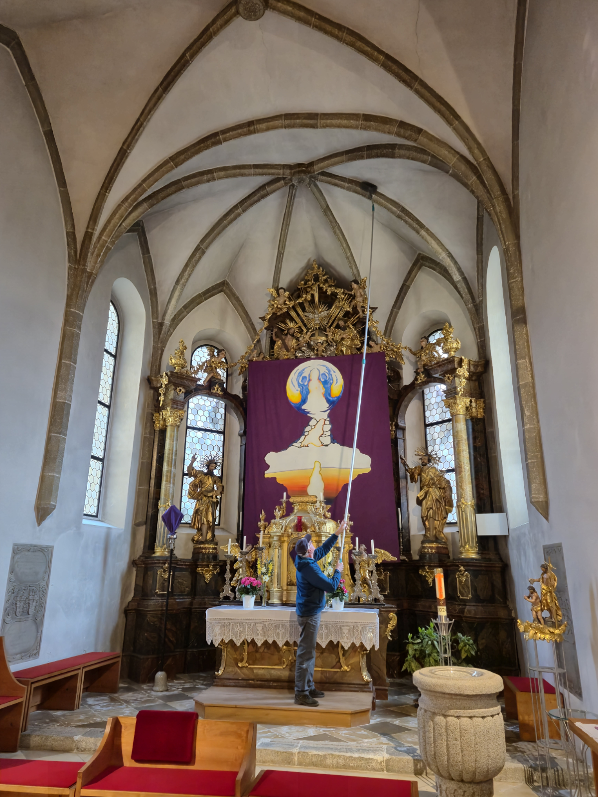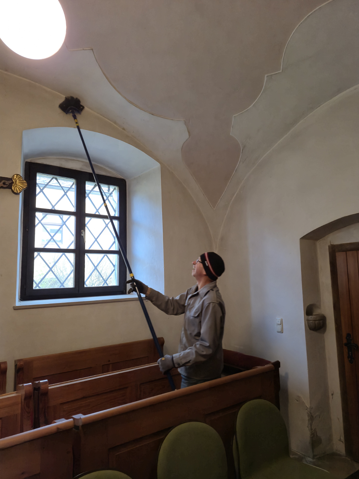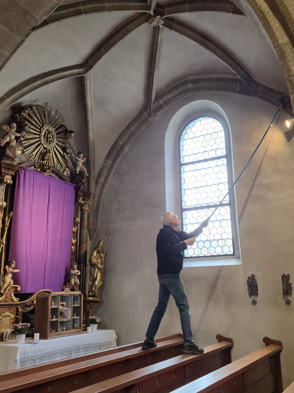 In Feldkirchen begann der Einsatz am Dienstag, 8. April 2025, mit drei Männern, die sich mutig in luftige Höhen wagten, um Spinnweben in der Pfarrkirche und den Nebenräumen zu entfernen. Am folgenden Tag übernahm das „Bodenpersonal“ die aufwendige Reinigung. Trotz des großartigen Engagements war spürbar: Die Arbeit war anstrengend und zeitintensiv – vor allem aufgrund fehlender freiwilliger HelferInnen.