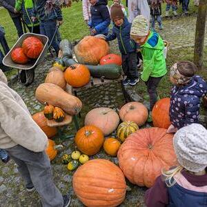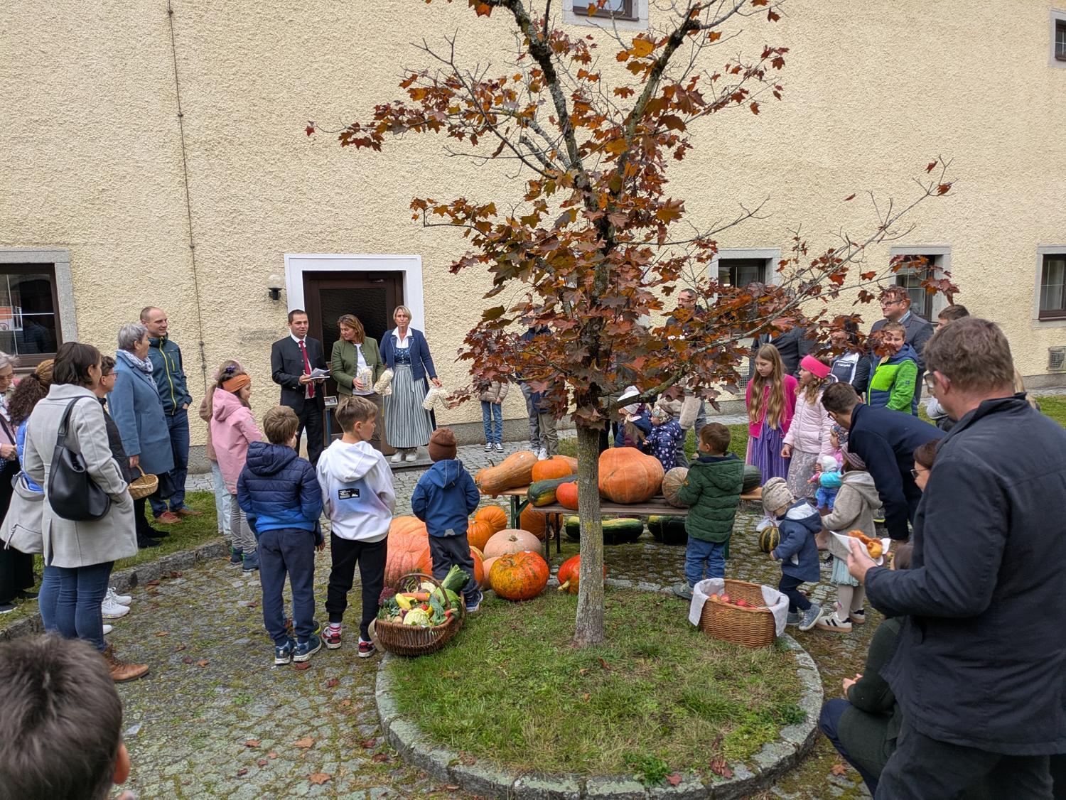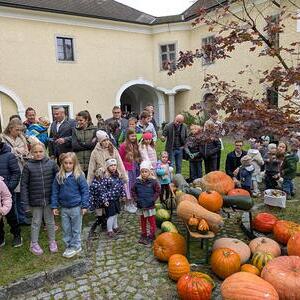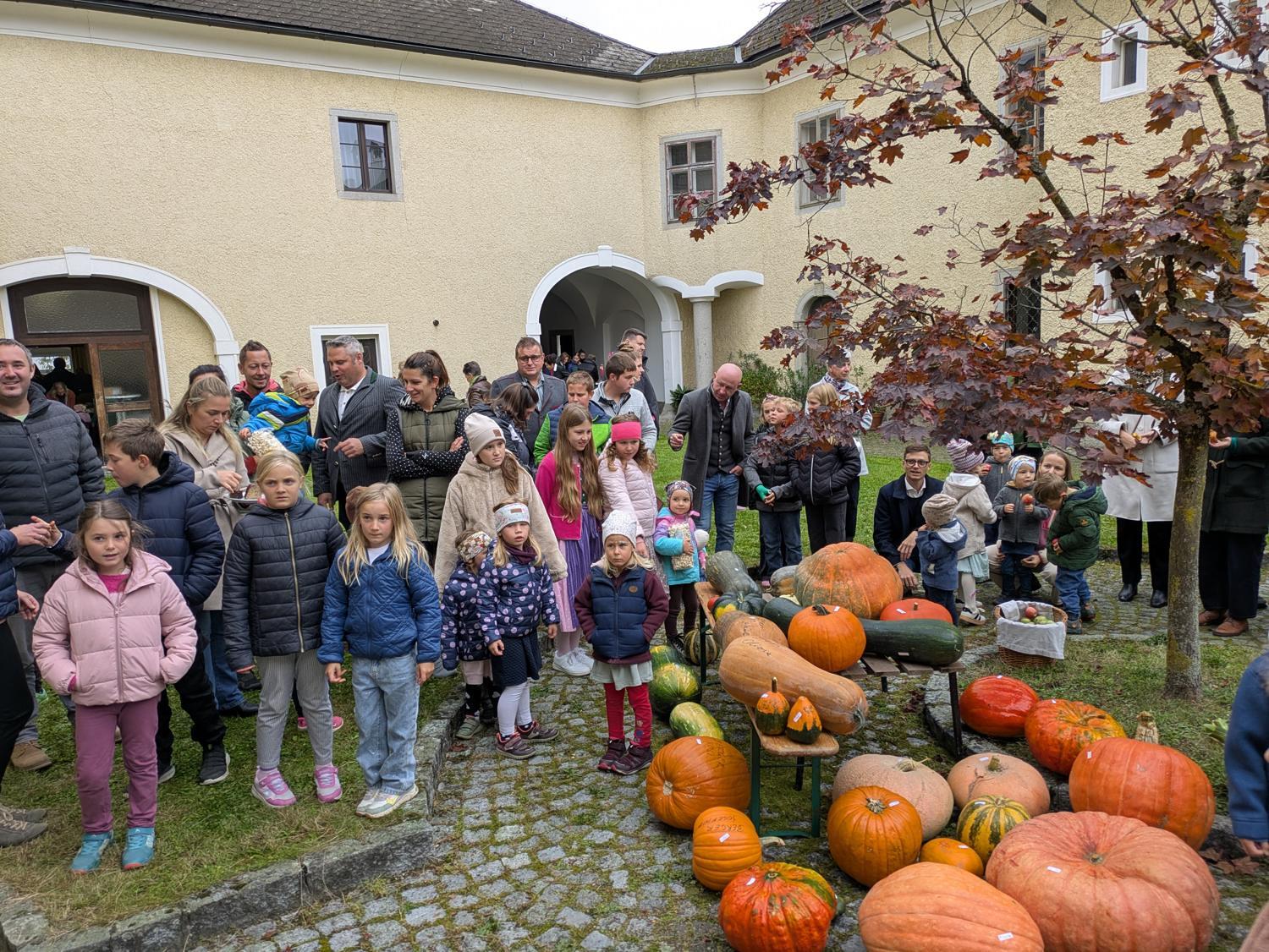 Nach der Messe luden die Landjugend und die Bauernschaft zum Verweilen ein: Gefeiert wurde im Pfarrsaal und draußen im Innenhof. Kürbisschmankerl, Apfelsaft und Most durften dabei nicht fehlen und bei der Kürbisprämierung konnten wieder viele große und kleine Exemplare bestaunt werden.
