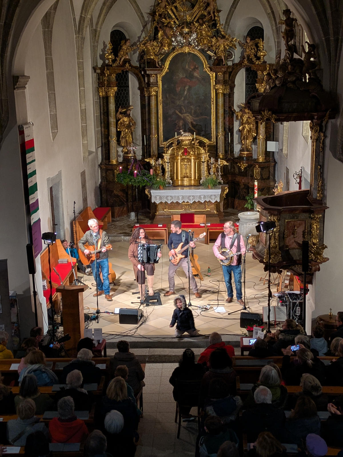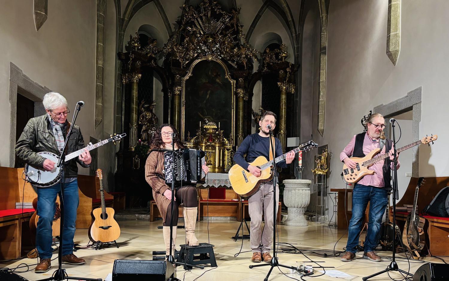 Daher ist es für eine große Freude, dass wir die Band für unser Adventkonzert am 7. Dezember in der Pfarrkirche im Rahmen des Adventmarktes gewinnen konnten. Die vier Musiker führten uns durch eine höchst abwechslungsreiche Klangreise durch die Welt englischsprachiger Weihnachtslieder und Folksongs.