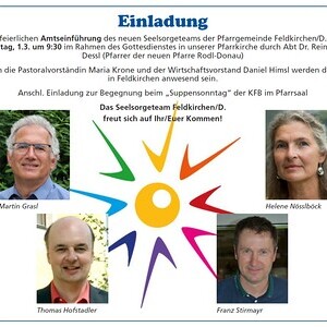 Der Gottesdienst 1. März 2026 steht zudem in einem besonderen Rahmen: In der Pfarrkirche findet die feierliche Amtseinführung des neuen Seelsorgeteams der Pfarrgemeinde Feldkirchen/Donau statt. Die Einführung erfolgt durch Abt Dr. Reinhold Dessl (Pfarrer der neuen Pfarre Rodl-Donau). Ebenfalls anwesend sind Pastoralvorständin Maria Krone und Wirtschaftsvorstand Daniel Himsl.