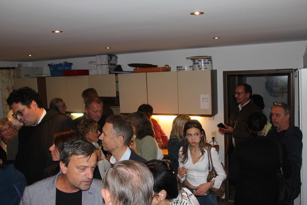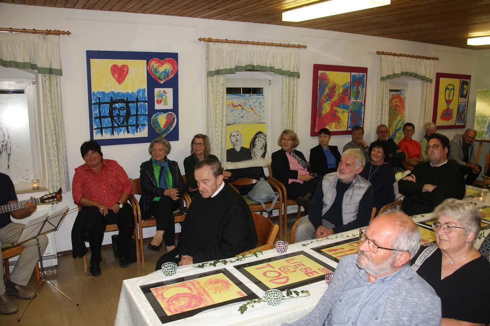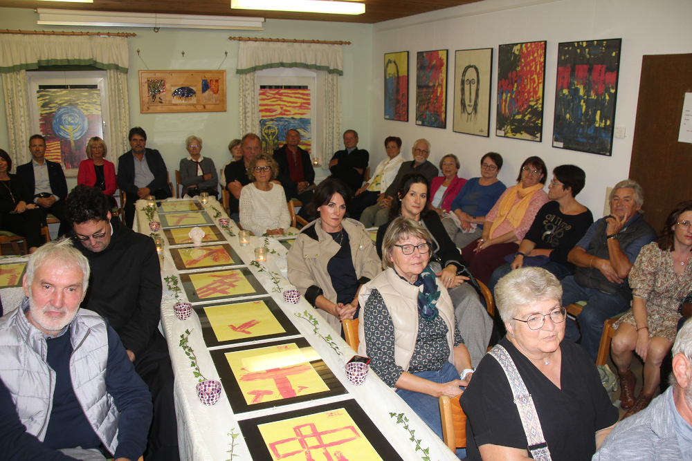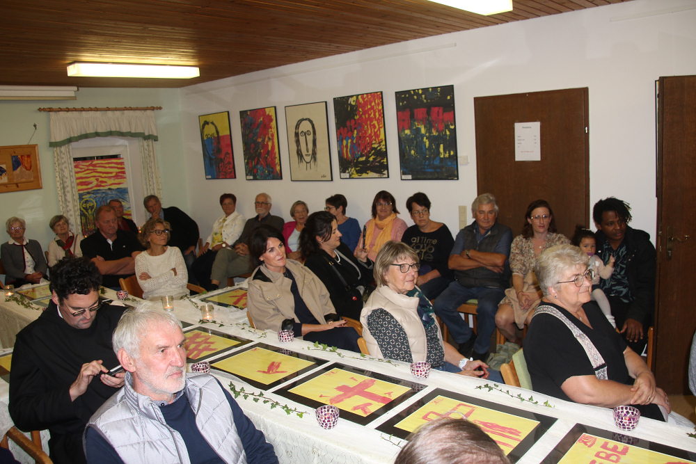 Am Vernissage-Abend stellte Traudi Mattes den Künstler Pater Alois vor – beschrieb seinen Werdegang und hob die Bedeutung der „Reduktion“ in seinen Werken hervor. Diese mache es für den Betrachter leichter möglich, den Sinn im Leid, der Trauer, der Freude, im Glauben …. ja im Leben ….zu erkennen. Der Kreuzweg wurde im Pfarrsaal auf dekorierten - zu einem Kreuz arrangierten Tischen - präsentiert. Pater Alois berichtete sehr interessant von seinen Schaffensprozessen und interpretierte einige seiner Werke in berührender Weise. Nachdenklich und beschwingt begleitete die Combo musikalisch den Abend. Die Eröffnung nahm dankenswerterweise Pater Franz Ackerl vor.