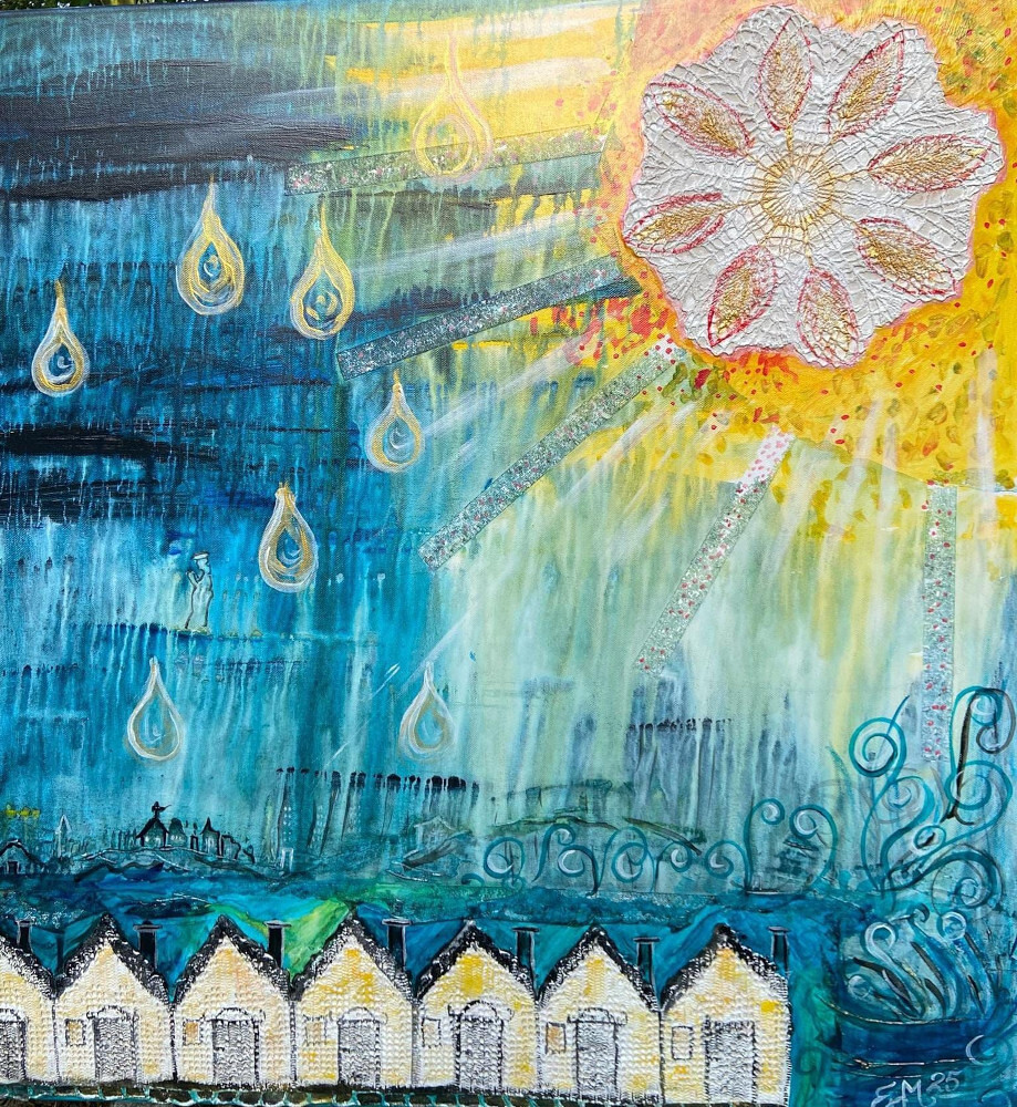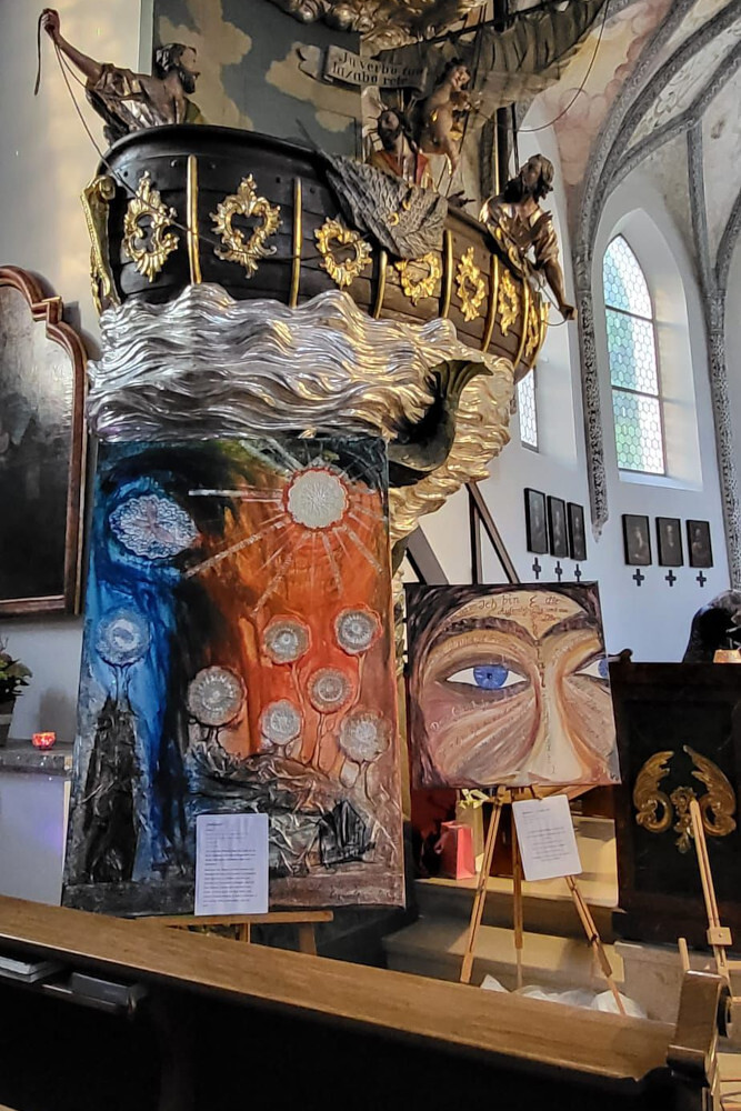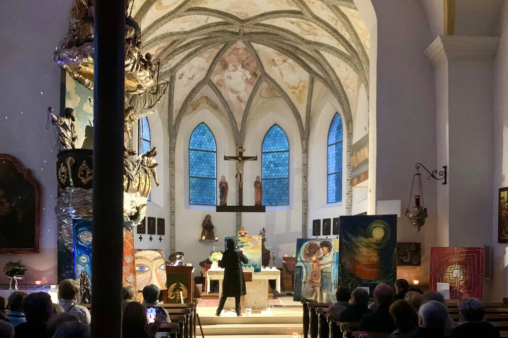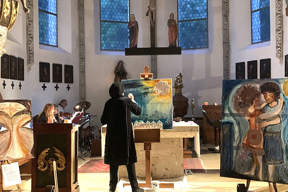 Traudi Mattes faszinierte mit einer Life-Malaktion zur Combo-Musik im Kirchenraum – es entstand ein Bild zum Thema: Tränen der Hoffnung.