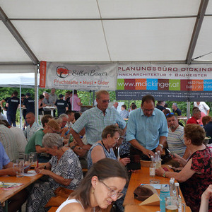 Anschließend ging es zum Frühschoppen ins Festzelt. Dort sorgte Siegi für musikalische Unterhaltung, und die Volkstanzgruppe zeigte ihr Können. Für das leibliche Wohl war bestens gesorgt – Bratwürstel, Torten, Kaffee und kühle Getränke waren bei der Hitze sehr willkommen.