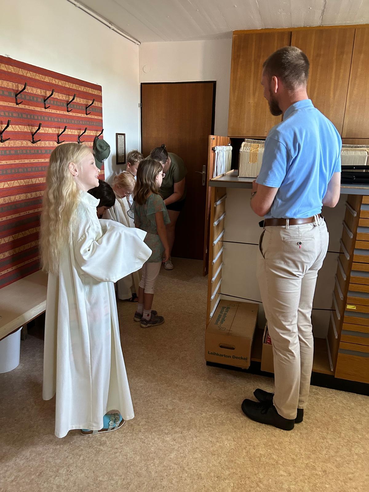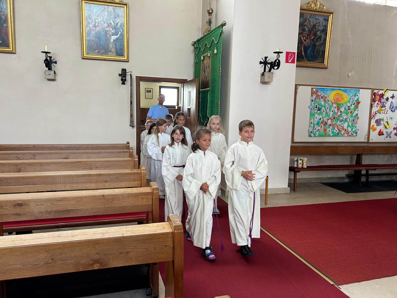 Alle Erstkommunionkinder unserer Pfarre waren eingeladen, sich die spannende Welt des Ministrierens einmal näher anzusehen. Wir haben uns sehr gefreut, dass 13 Kinder dieser Einladung gefolgt sind. Voller Schwung und mit vielen Fragen wurde zunächst einmal die Sakristei erkundet. Dann durften die Kinder bereits das Ministrantengewand anprobieren und gleich wurden auch schon die ersten Übungen in der Kirche gemacht. Unsere „großen“ Ministrant:innen unterstützten die Gruppe wie immer ganz wunderbar. Die nächste Schnupperstunde findet am Samstag, 13. Juli um 10.00 Uhr in der Kirche statt. Neue Kinder sind nach wie vor herzlich willkommen. Die Aufnahme in die Gruppe der Ministrant:innen findet am Kirtag statt.