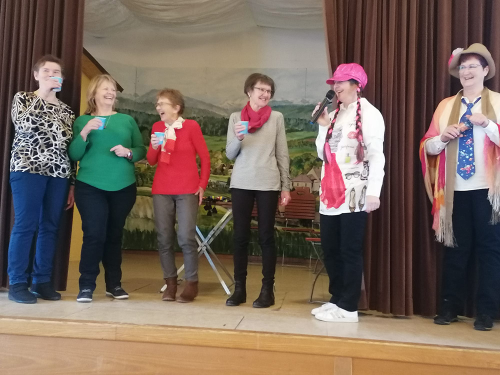 Bei den Gstanzln zum Auftakt wurde nicht nur unser Herr Pfarrer aufs Korn genommen, so manche Besucherin wird im Stillen gehofft haben, dass keines ihrer Hoppalas bekannt geworden ist. „Michelle aus Frankreich“ beeindruckte mit ihren „Gemälden mit Menschen“, und kurzweilige Geschichten und Anekdoten brachten uns zum Lachen. Das „Schleissenscheit“ verlangte vollen Einsatz in Wortakrobatik bei den mutigen Frauen auf der Bühne und brachte heitere Stimmung in den Pfarrsaal.