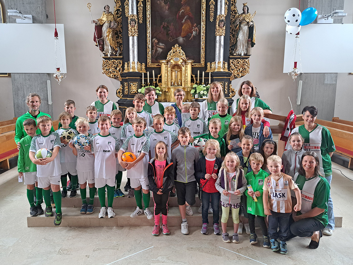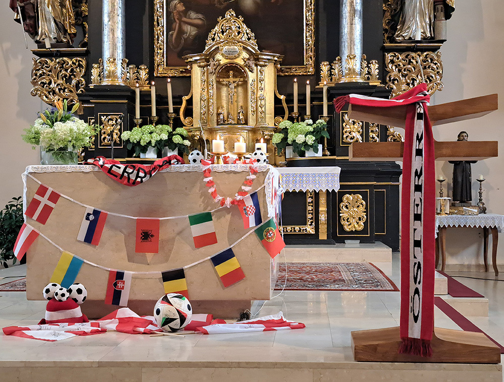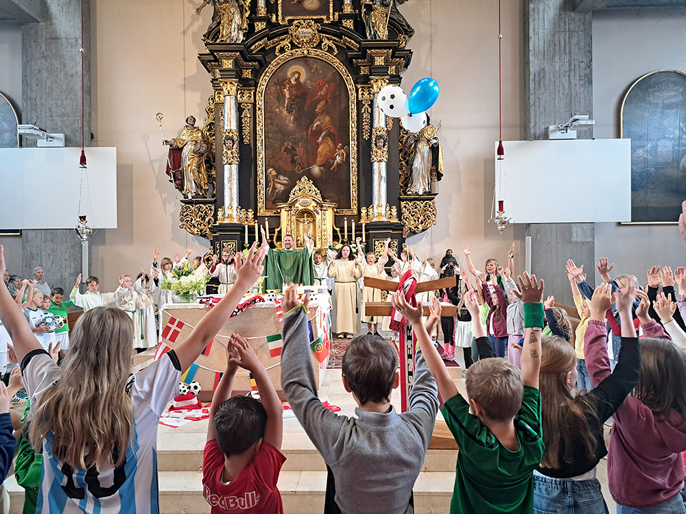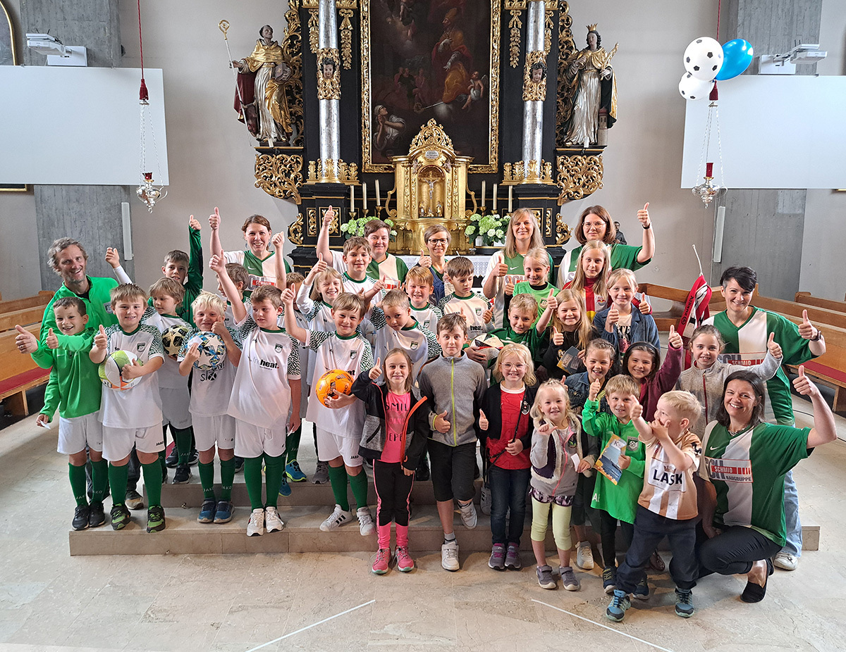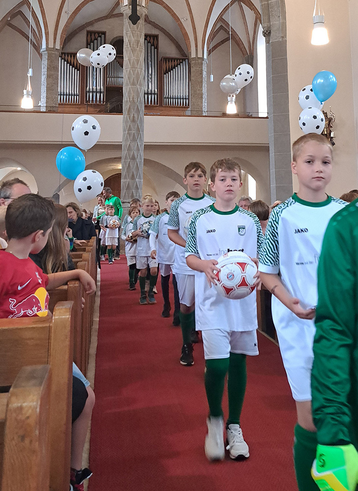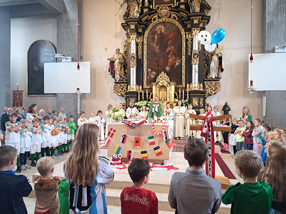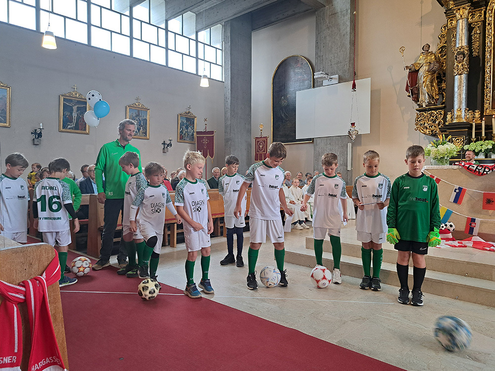 Ganz besonders in diesem Jahr war der "Anpfiff" um 9 Uhr zur Familienmesse, die anlässlich der EM ganz im Zeichen des Fußballs stand. Alle Kinder kamen in Sportdressen und eine ganze Fußballmannschaft war zu Besuch, um ihre Tricks zu präsentieren und gemeinsam mit Pfarrer Christoph Buchinger und wichtigen Vertretern der Pfarre die vielen Parallelen zwischen einer Fußballmannschaft und einer Christenmannschaft bewusst zu machen: beide müssen zusammenhelfen, um als Team gut zu funktionieren; beide haben gewisse Regeln; beide haben eine Art Trainer bzw. Schiedsrichter u.v.m.