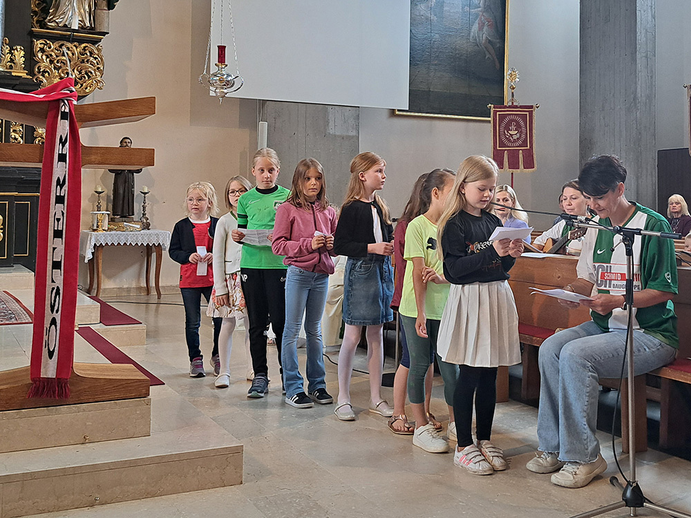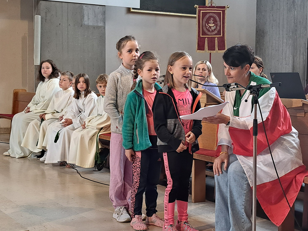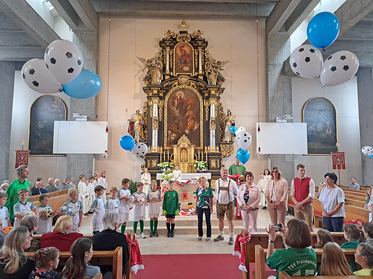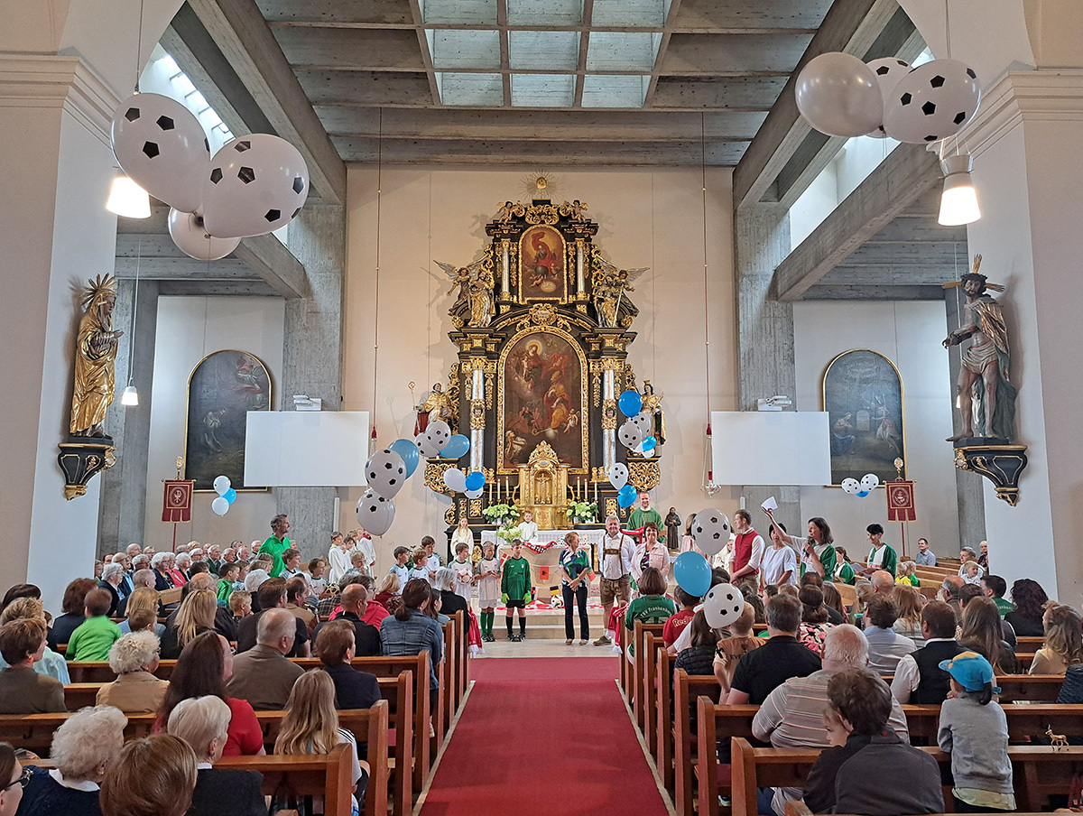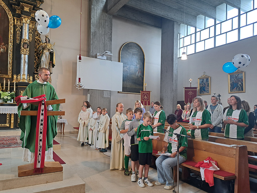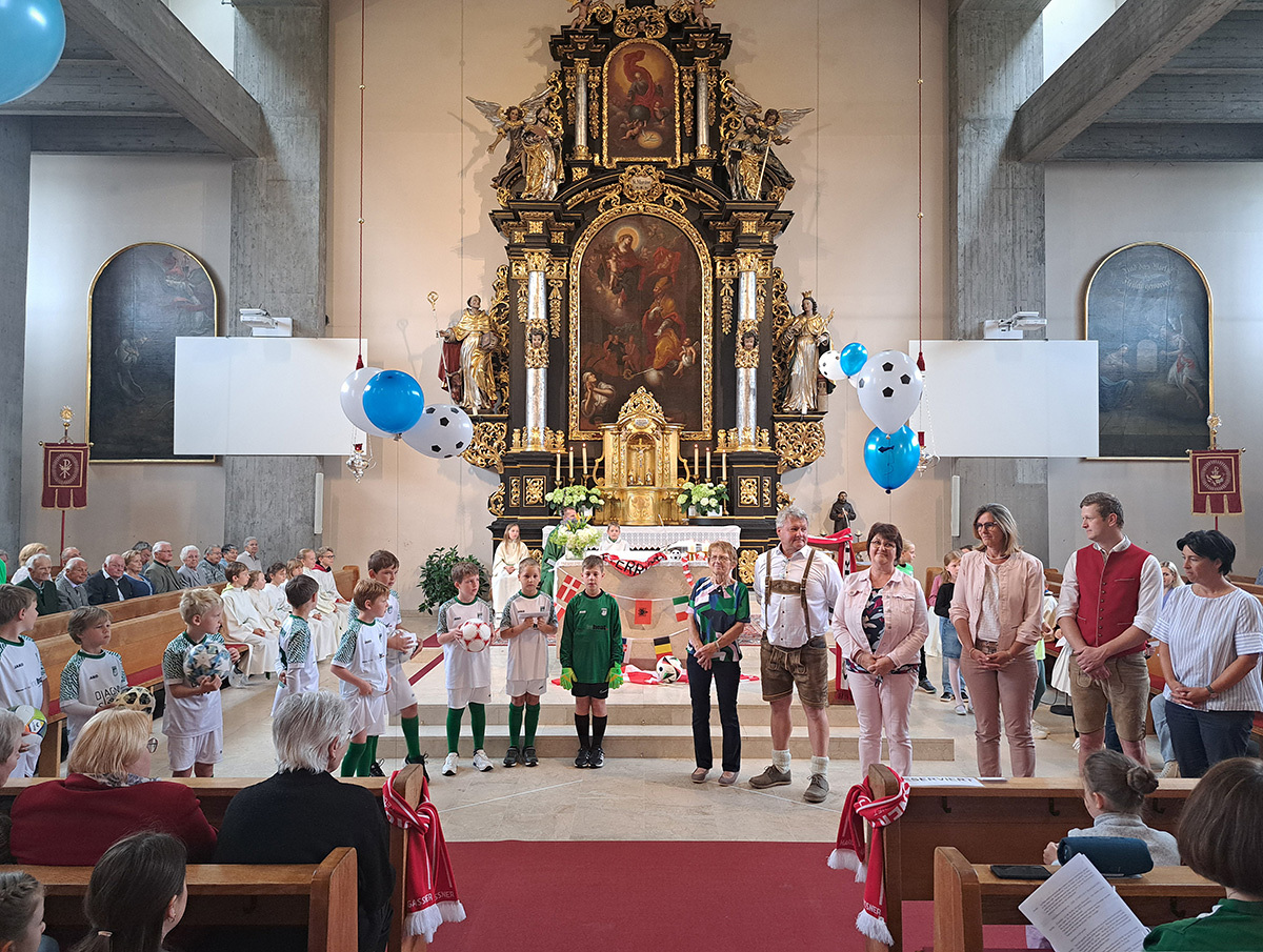 Ganz besonders in diesem Jahr war der "Anpfiff" um 9 Uhr zur Familienmesse, die anlässlich der EM ganz im Zeichen des Fußballs stand. Alle Kinder kamen in Sportdressen und eine ganze Fußballmannschaft war zu Besuch, um ihre Tricks zu präsentieren und gemeinsam mit Pfarrer Christoph Buchinger und wichtigen Vertretern der Pfarre die vielen Parallelen zwischen einer Fußballmannschaft und einer Christenmannschaft bewusst zu machen: beide müssen zusammenhelfen, um als Team gut zu funktionieren; beide haben gewisse Regeln; beide haben eine Art Trainer bzw. Schiedsrichter u.v.m.