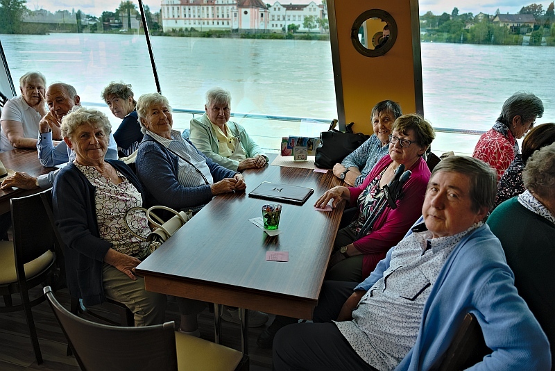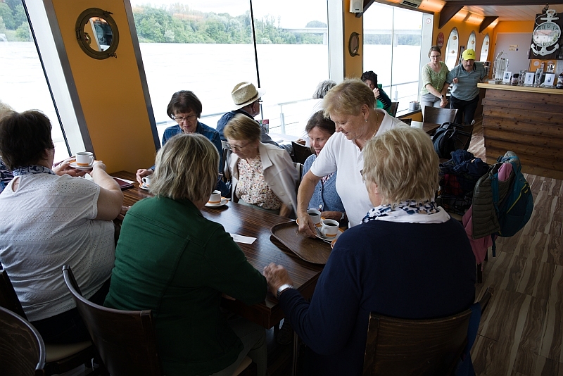 Nach dem sehr interessanten Vortrag fuhren wir nach Schärding ins „Wirtshaus zur Bums´n“ zum Mittagessen. Anschließend brachte uns der Bus zur Anlegestelle am Inn, wo wir auf das Schiff die „MS – Schärding“ stiegen und mit Kaffee und köstlichem Kuchen bewirtet wurden.