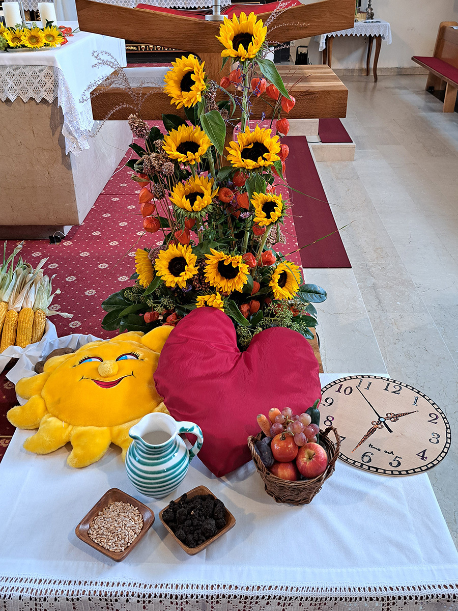 Die tüchtigen Mädchen und Buben des Kinderliturgiekreises brachten ihre Gaben zum Altar: Erde, Wasser, Sonne, Herz, Uhr, Samenkörner, Obst und Gemüse, Hostien und Wein. Alles Symbole für unsere Gaben, Talente, Freuden, Lebenswerte und Gemeinschaften.