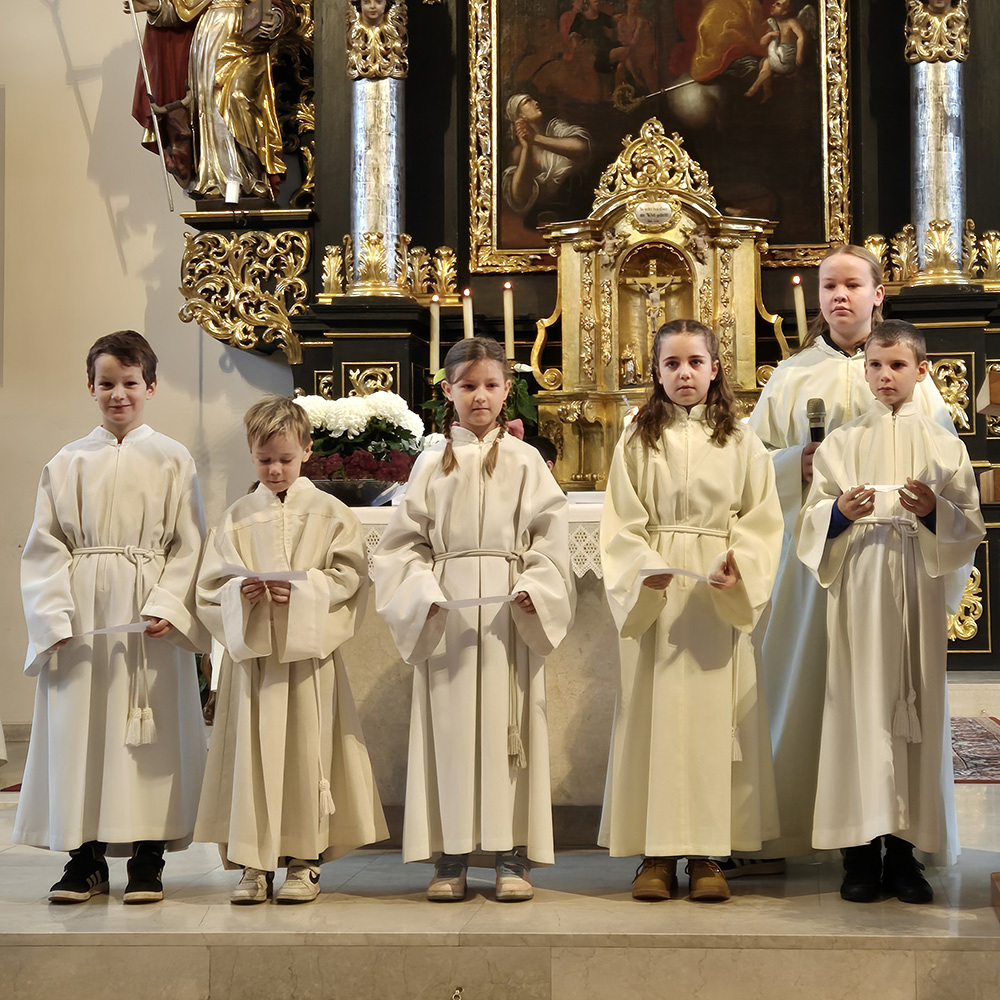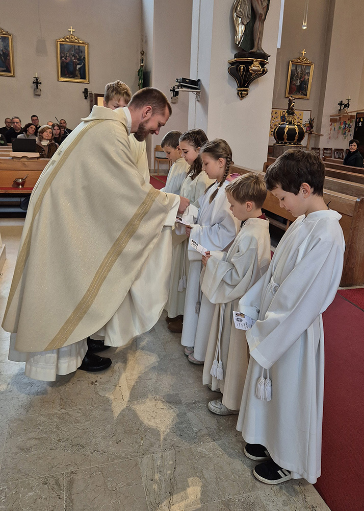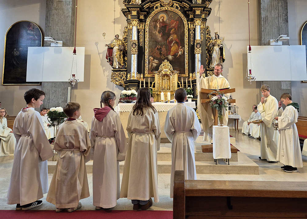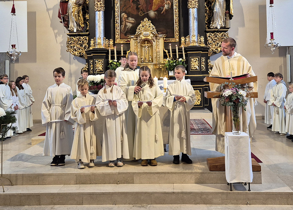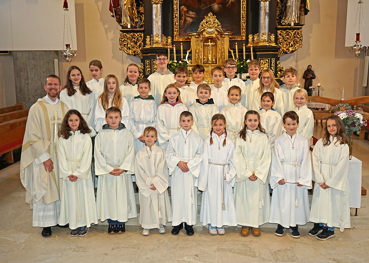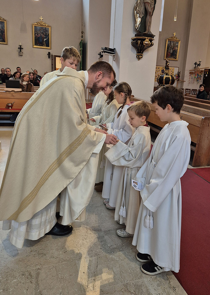Pfarrer Christoph freute sich sehr über die Neuaufnahmen und dass zu diesem Anlass so viele aus der großen Gruppe der Ministrant:innen (45 insgesamt) gekommen sind.