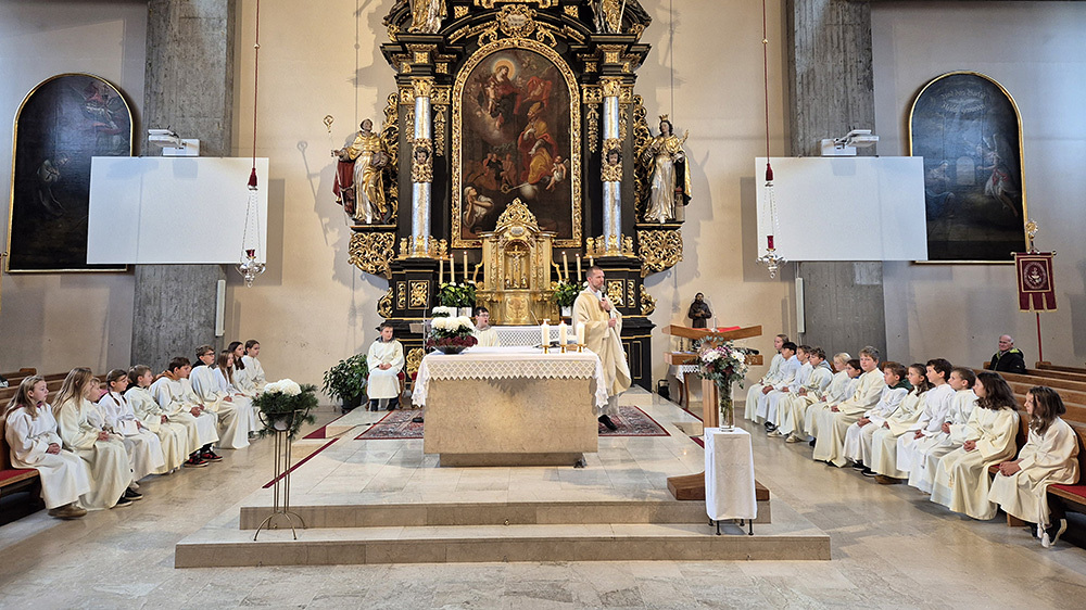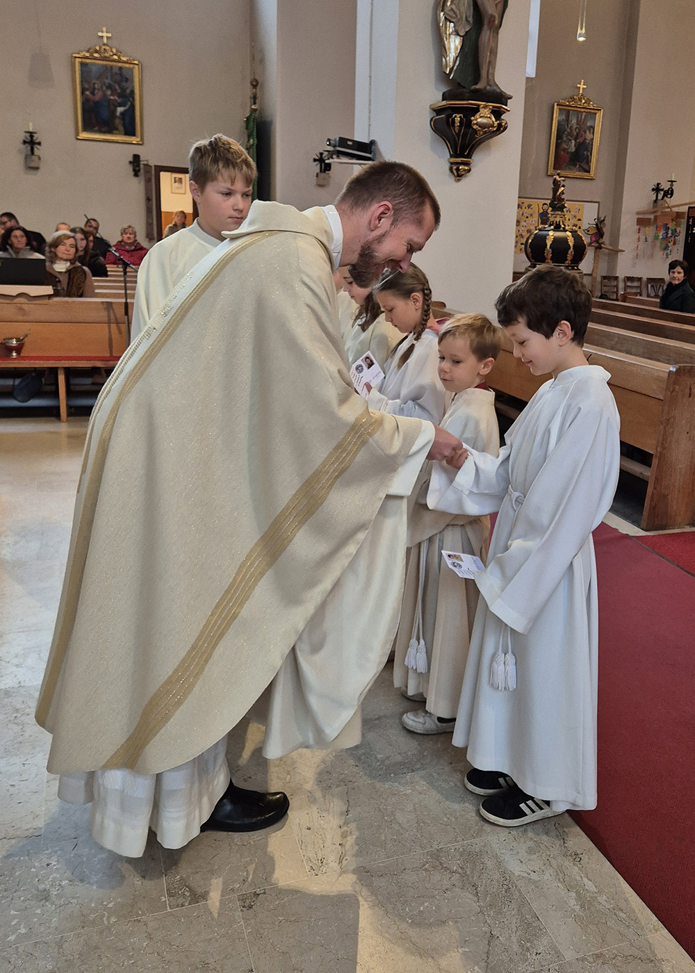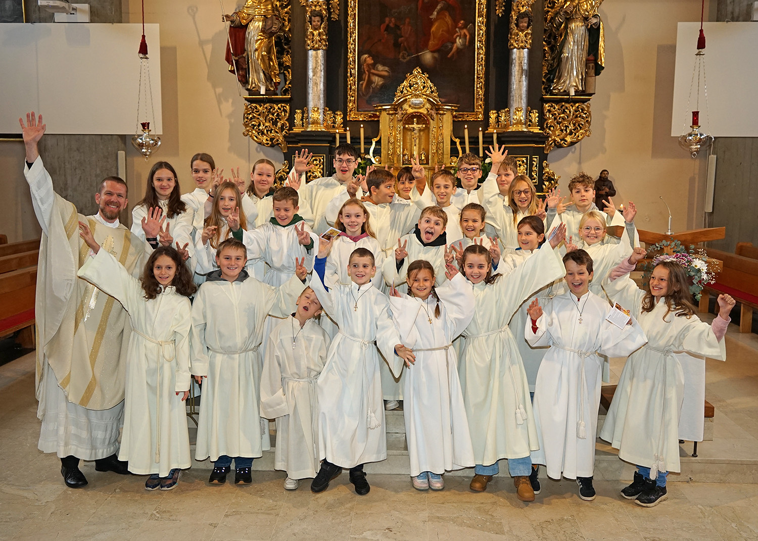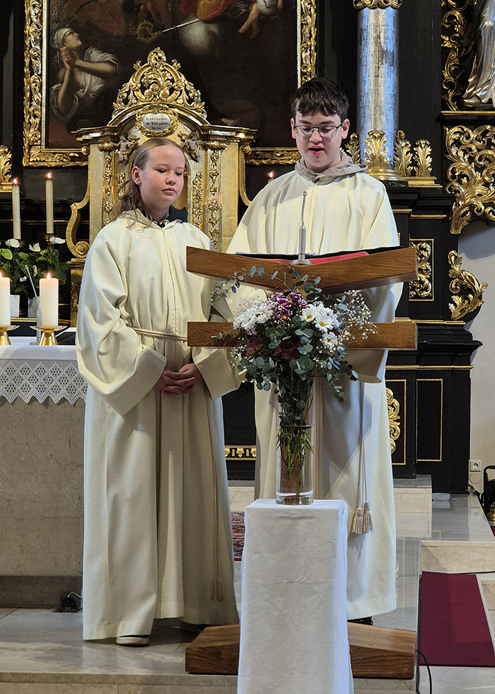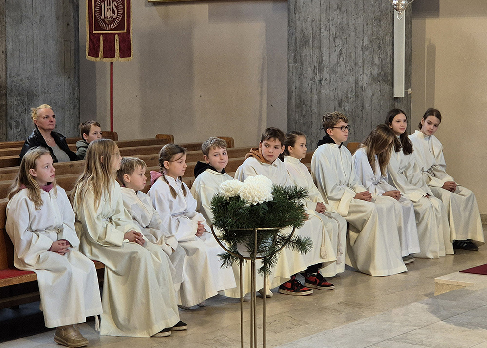 Pfarrer Christoph freute sich sehr über die Neuaufnahmen und dass zu diesem Anlass so viele aus der großen Gruppe der Ministrant:innen (45 insgesamt) gekommen sind.