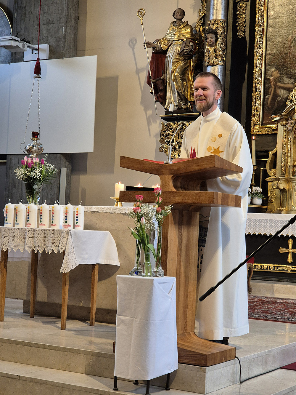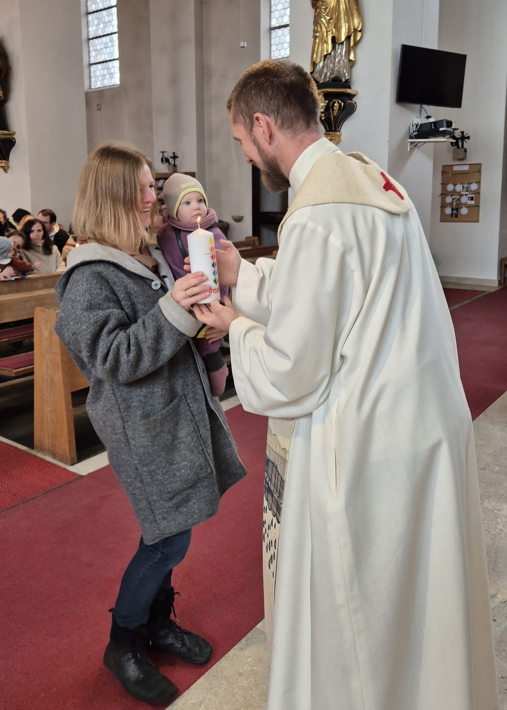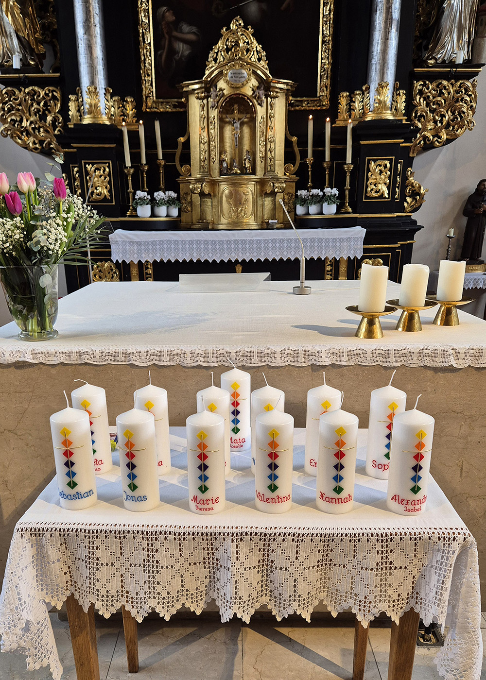 Pfarrer Christoph segnete die von Elisabeth Degeslegger mit dem Namen des Kindes gestalteten Kerzen, die an der Osterkerze angezündet und jeder Familie überreicht wurden. Jedem Täufling legte er noch einmal die Hand auf, segnete ihn mit dem Kreuzzeichen und gab jedem einzelnen gute Wünsche mit auf den Weg.