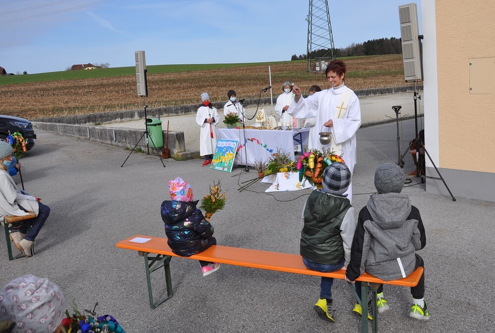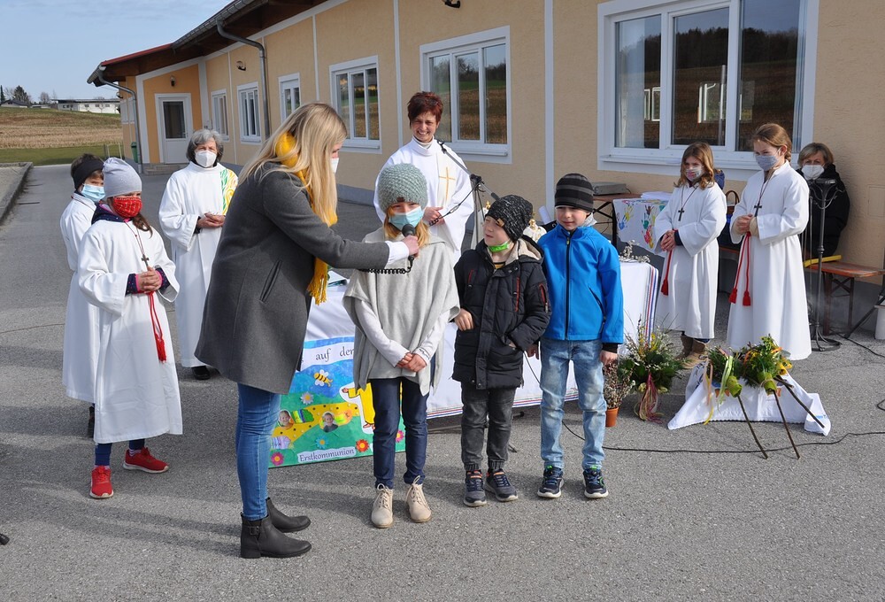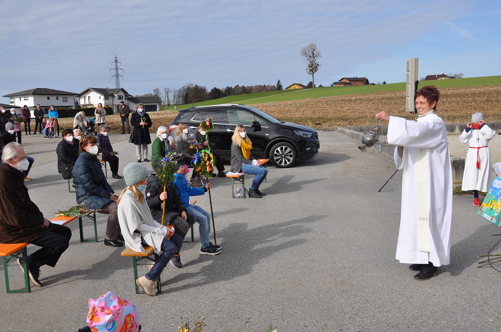 Unsere Pfarrbevölkerung feierte bei schönem Frühlingswetter unter Leitung unsere Pfarr-Begleiterin Sabina Eder, bei Einhaltung der Corona-Sicherheitsmaßnahmen, eine sehr stimmungsvolle Wortgottesfeier. Dabei wurden die mitgebrachten Palmbuschen gesegnet und unsere drei Erstkommunionkinder den Anwesenden vorgestellt.