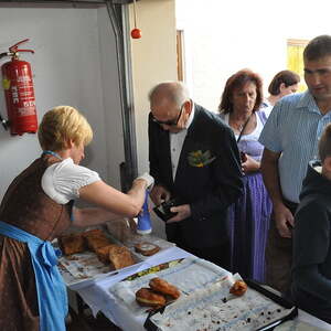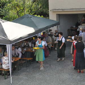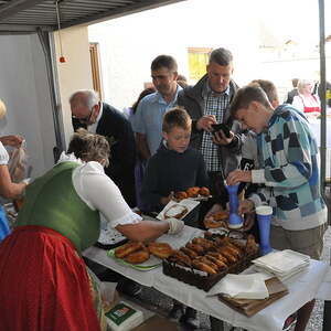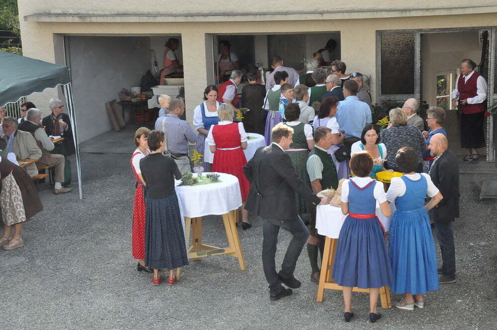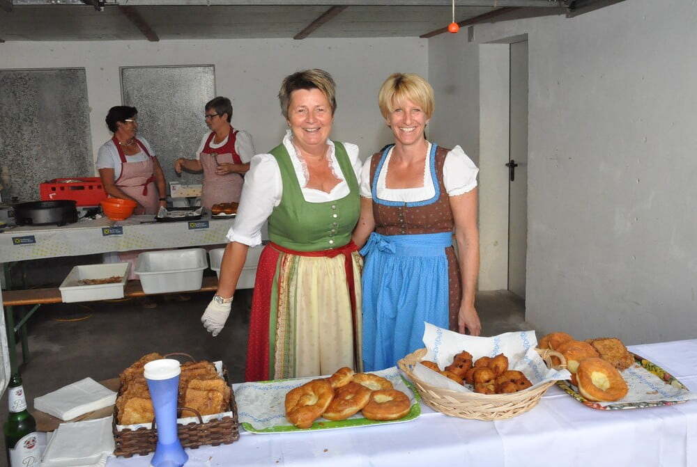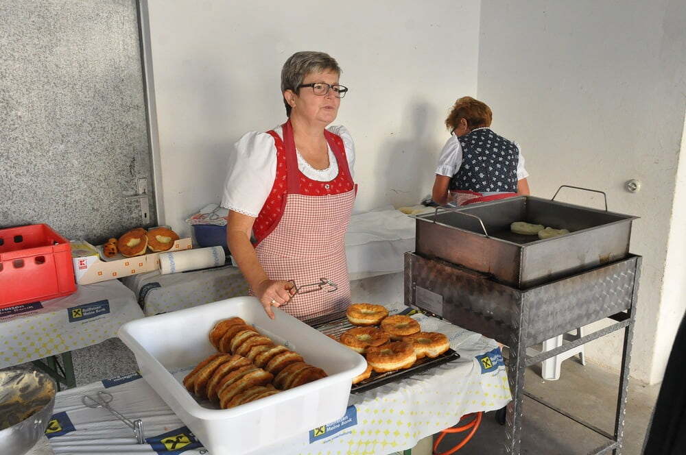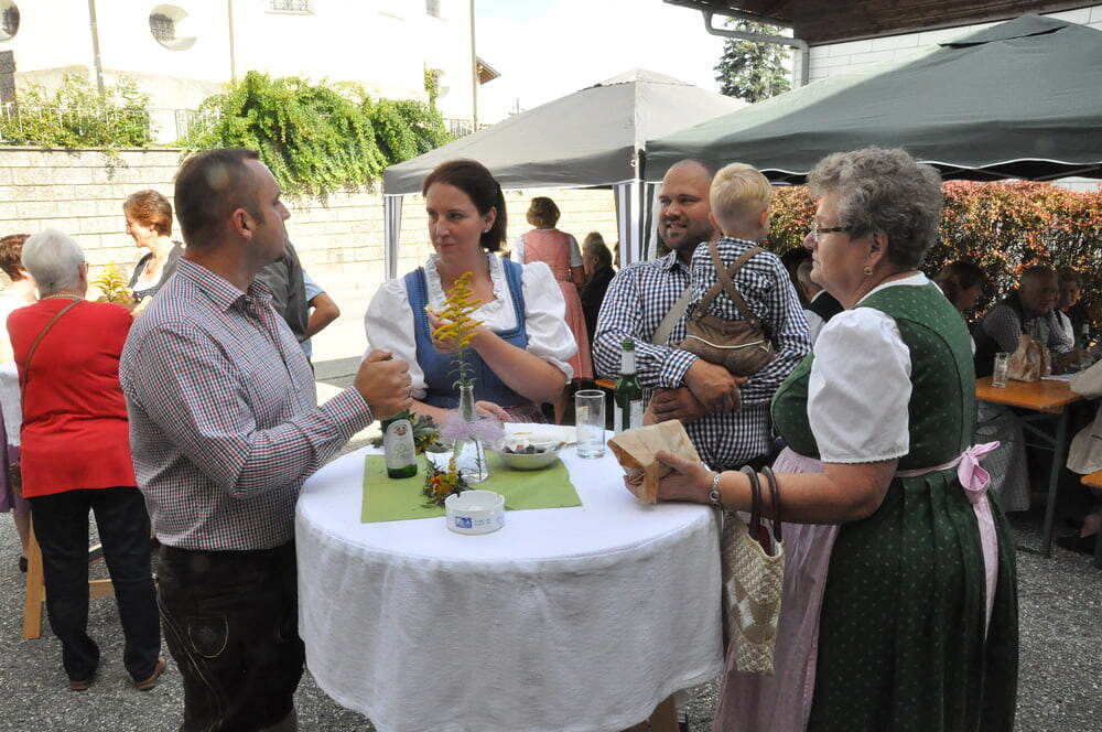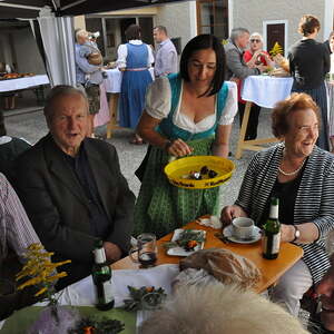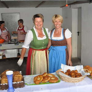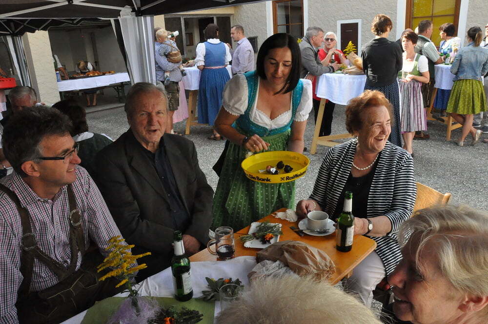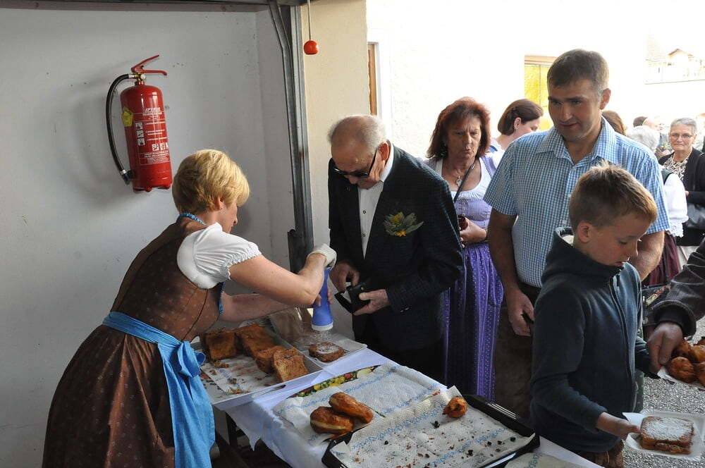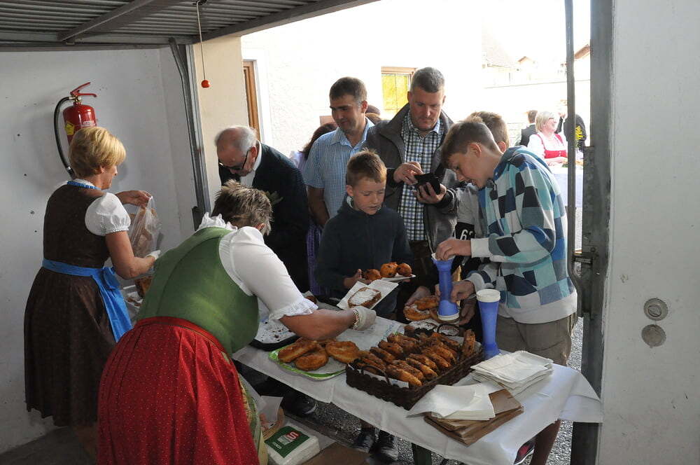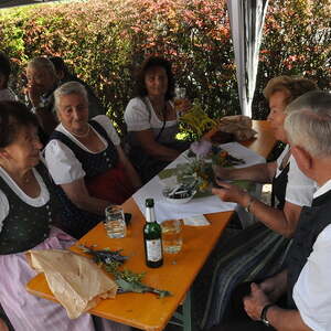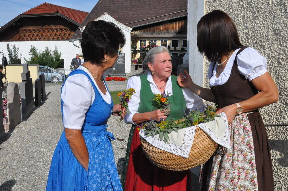 Die Körbe mit den Kräutersträußchen wurden von den Goldhaubenfrauen angefertigt, die auch den Frühschoppen vor dem Pfarrheim durchführten. Köstliches Schmalzgebäck, Würstchen und Getränke wurden ebenfalls von unserer Goldhaubengruppe angeboten.
