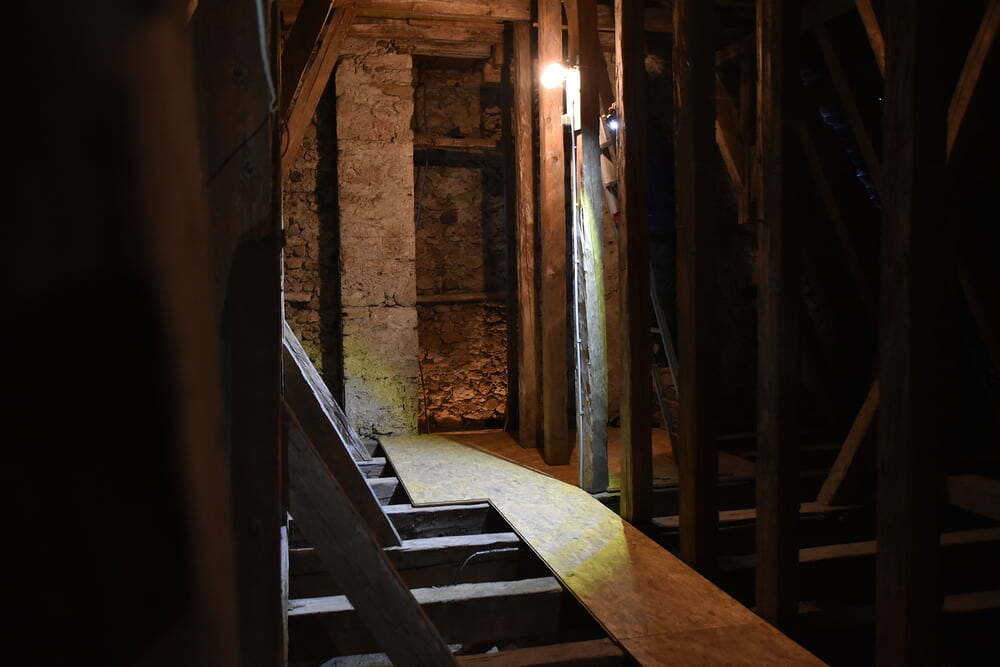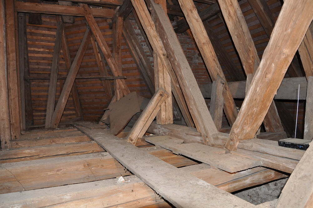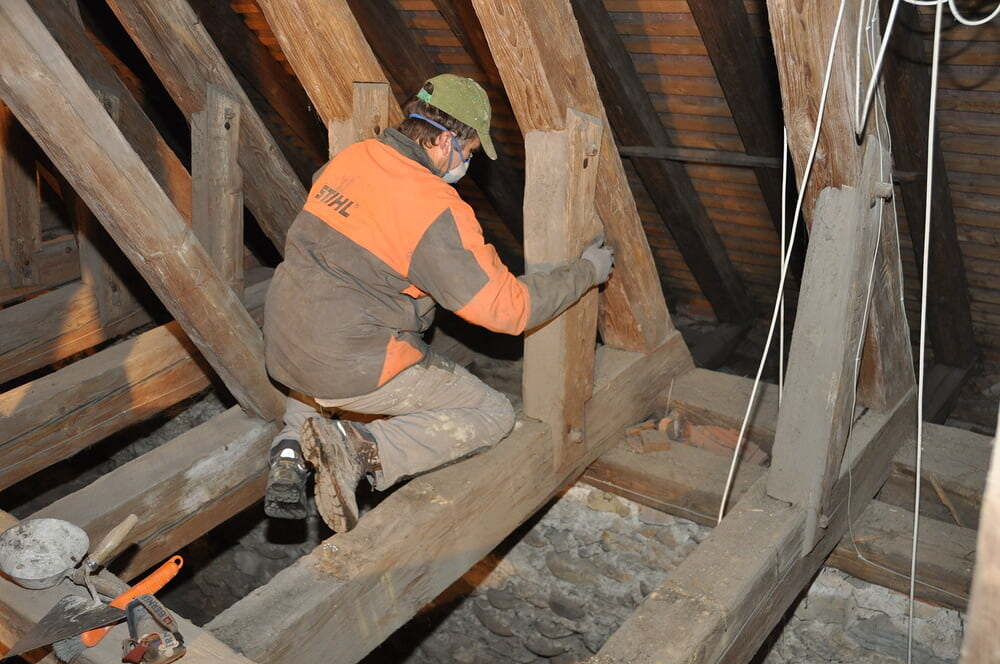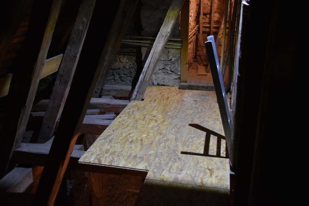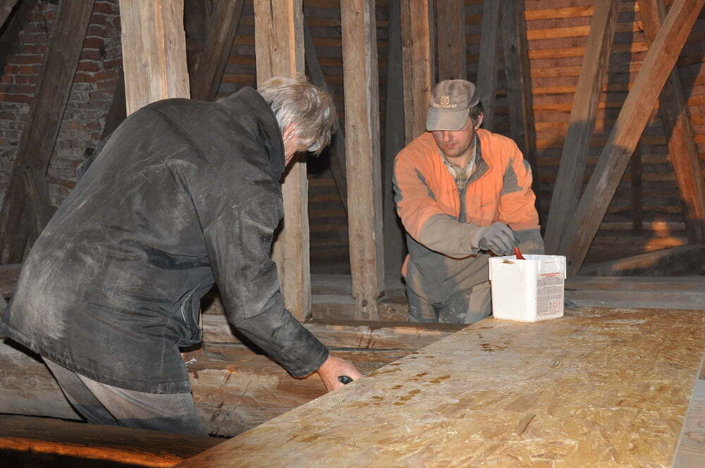 Auch die Laufbretter auf den drei Dachstuhlebenen, die meisten mit Holzwurmbefall, wurden durch Großspanplatten (OSB-Platten) ersetzt.