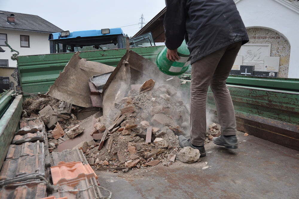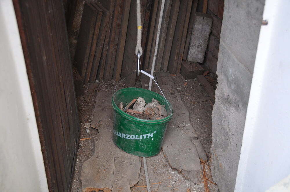 In drei anstrengenden Tagen schafften es die sechs Mann, siehe Fotos, die Säuberung durchzuführen. Unglaubliche 9-10 m3 Material wurden mittels Kübel durch den Turmschacht abgelassen und mittels Maschineneinsatz abtransportiert und entsorgt.