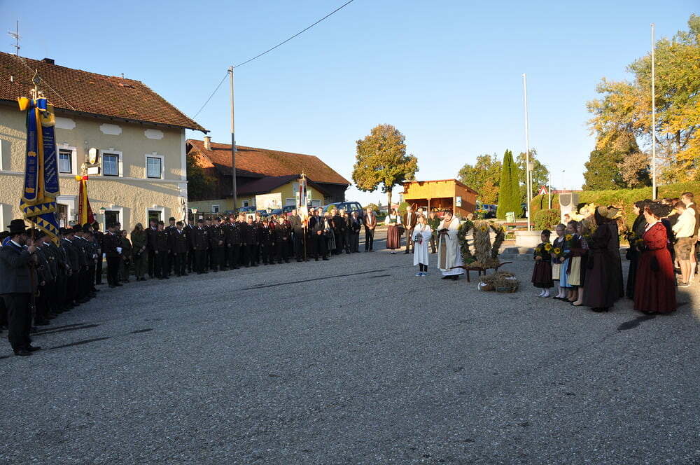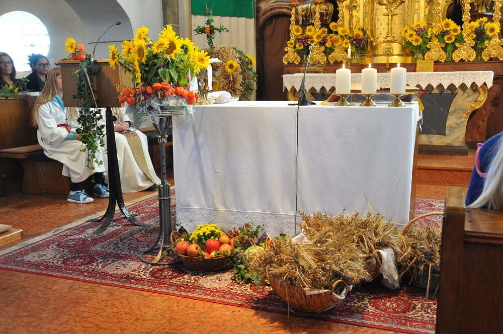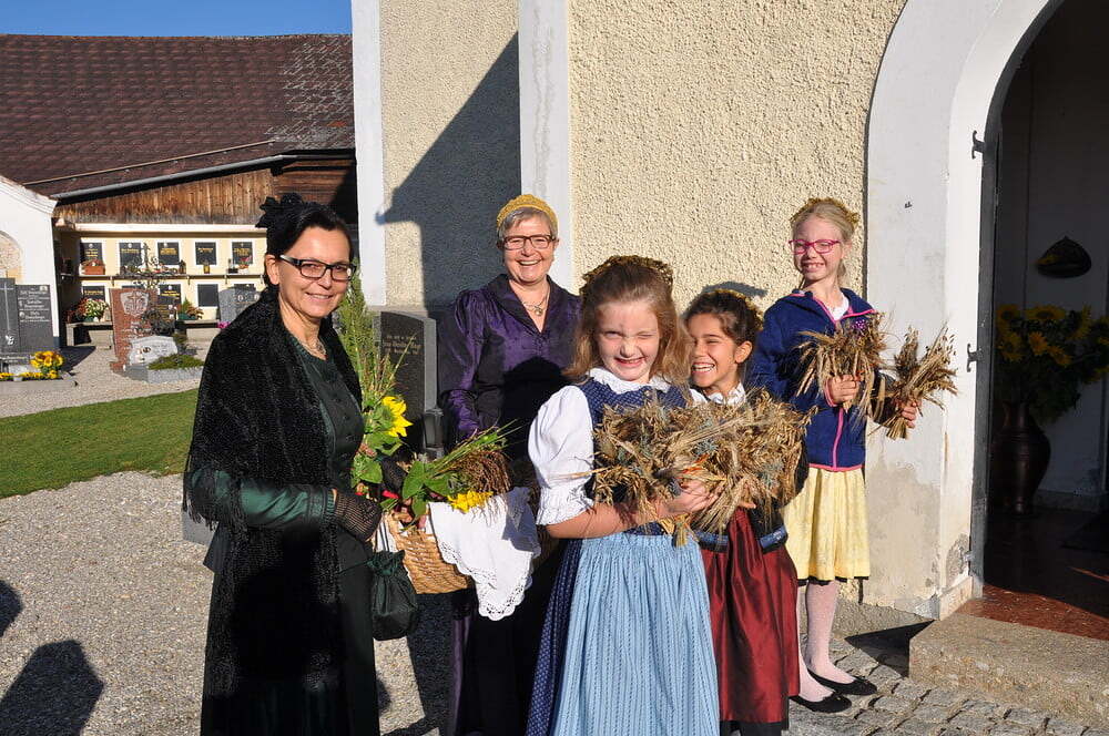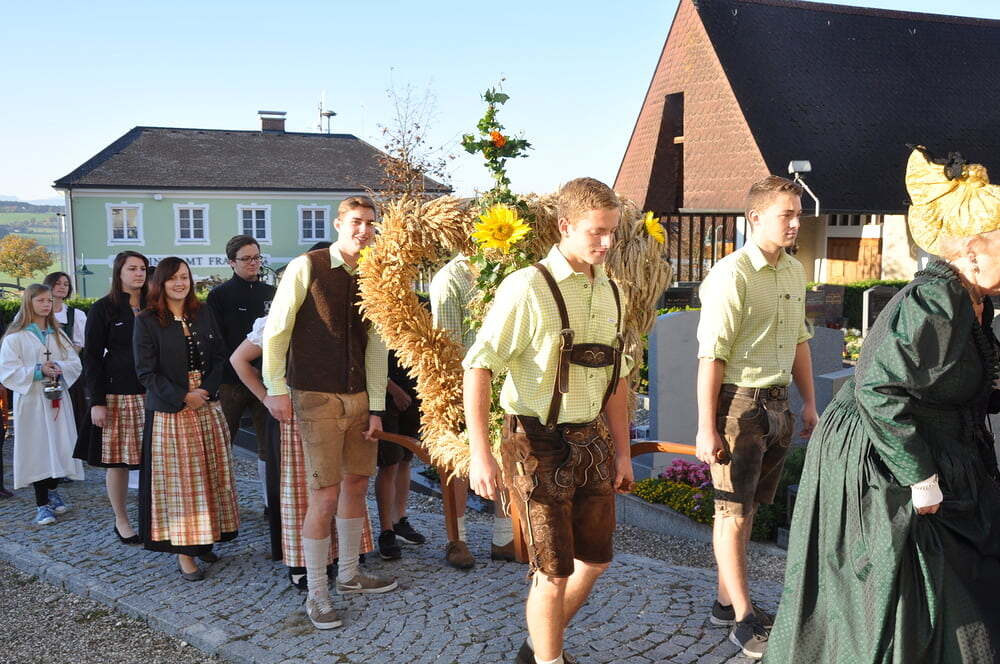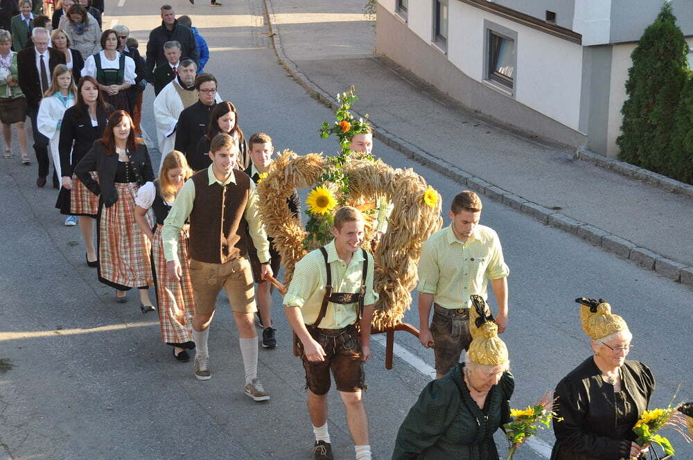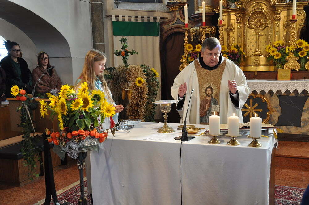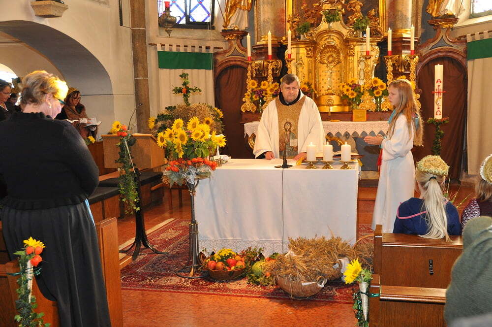 ihren Helferinnen für den wunderbaren Kirchenschmuck, bei der Ministrantin, bei der Landjugend für die Herstellung der prächtigen Erntekrone, bei der Musikkapelle und den Vereinen und nicht zuletzt für die Kollekte.