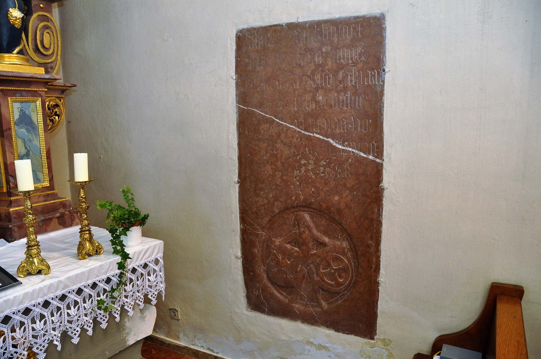 Das Edelgeschlecht von Franking stiftete 1570 eine Erinnerungstafel. Zu sehen an der rechten Säule, wo das Weihwasserbecken stand.