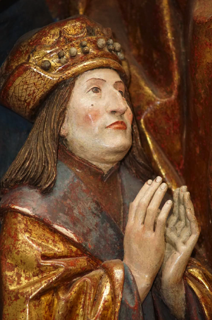 Kaiser Maximilian I.: Der Stifter selbst hat sich in an bevorzugter Stelle, zur Rechten der Gottesmutter kniend verewigen lassen. Jedoch dürfen wir die klare Botschaft, die er uns durch dieses Bildnis über die Jahrhunderte hinweg mitteilen möchte nicht übersehen: Er kniet demütig, ohne die Insignien seiner Macht, unbeirrbar die Augen auf das Jesuskind gerichtet, die Hände hoch erhoben zum Gebet. Sein Haupt ist anstatt einer Krone mit einer Haube bedeckt. In dieser Darstellung erkennen wir deutlich den Wunsch des kaiserlichen Stifters.