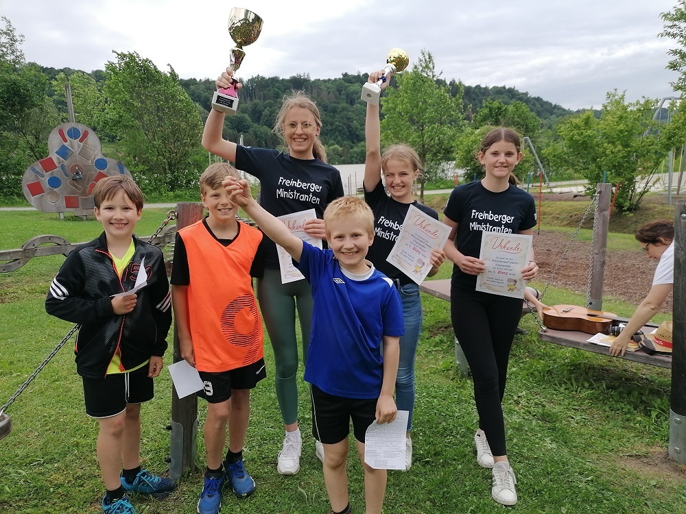 Es waren 15 Stationen zu bewältigen (Geschicklichkeit, Wissen.,...). Für den Sieg bekamen sie einen Pokal für die Pfarre und einen Wanderpokal der wandern wird! Für alle teilnehmenden Minis gab es eine Urkunde, Eis und Verpflegung. Natürlich durfte auch ein Luftballonstart und ein Schätzspiel nicht fehlen. Abschließend feierten alle gemeinsam noch eine kurze Andacht.