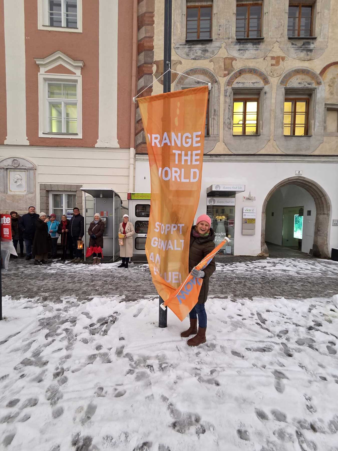 Um 16 Uhr wurde vor dem Rathaus die orange Fahne der UN-Women-Kampagne gehisst – organisiert von Frauen aus der Stadtpolitik aller Parteien, der Initiative Fraustadt Freistadt sowie der Frauenberatungsstelle BABSI.