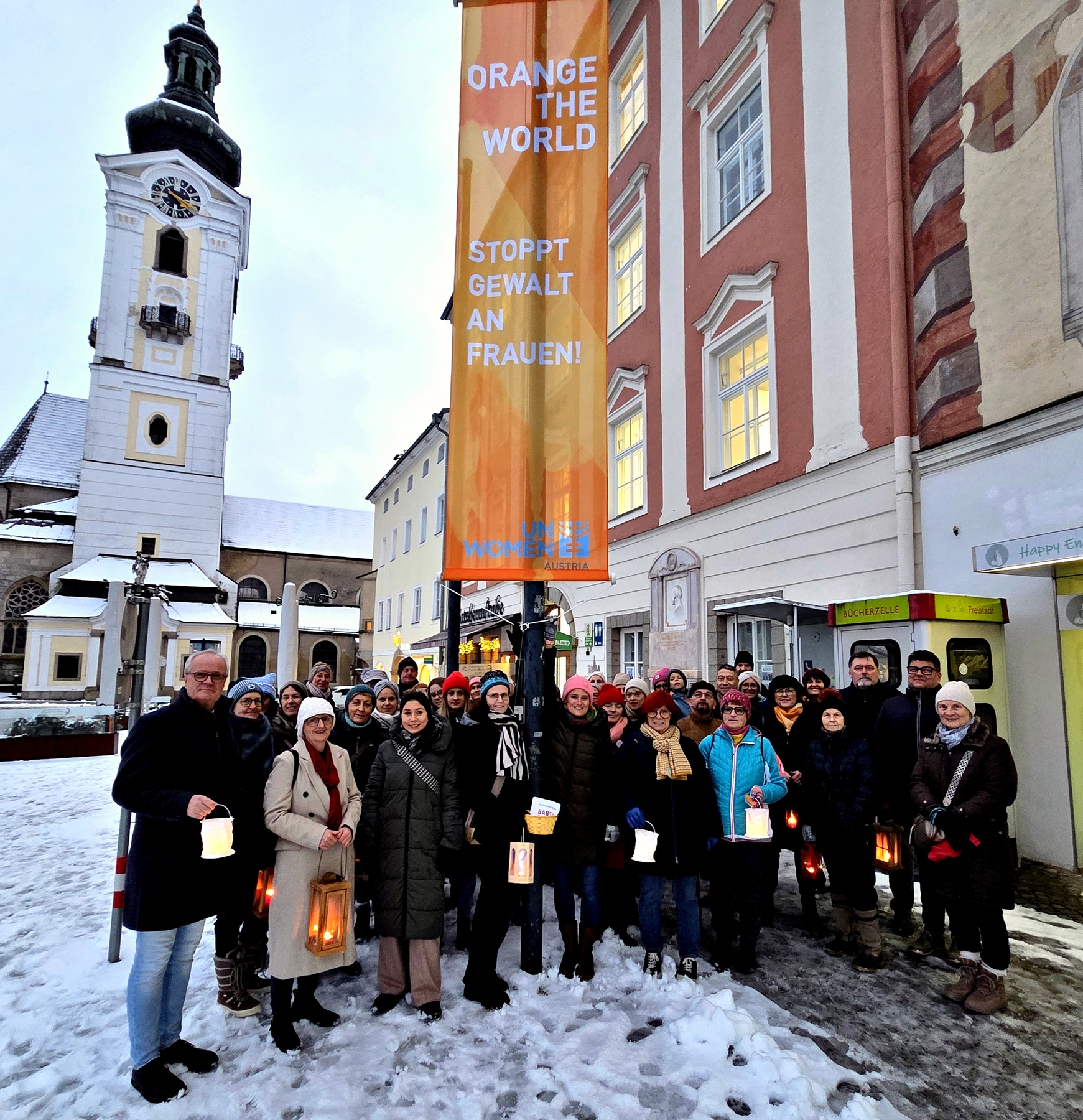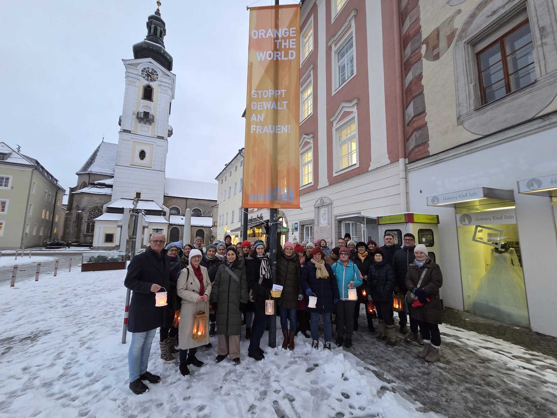 Im Anschluss an den Fahnenaushang zog ein Lichterzug mit rund 40 Teilnehmer:innen durch die Freistädter Innenstadt. Mit Laternen, Licht und sichtbarem Zusammenhalt wurde ein deutliches Signal gegen Gewalt an Frauen und Mädchen gesetzt.