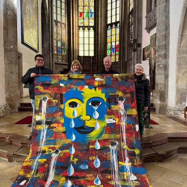 Erich Traxler, Künstler aus Windhaag bei Freistadt: „Im Jahr 2020 arbeitete ich an einem Bild welches in diesem Fastentuch mit dem Titel „Die Menschen weinen schon“, endete. Das Fastentuch ist heuer in der Stadtpfarrkirche Freistadt zu sehen. Gemeinsam mit einer auf einem tönernen Kopf ruhenden Dornenkrone, stellt es meine Interpretation des Leidensthemas dar.