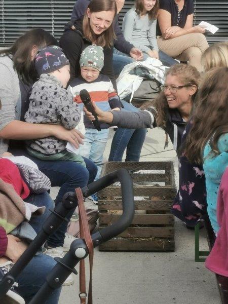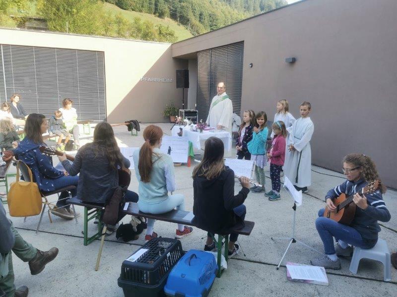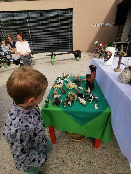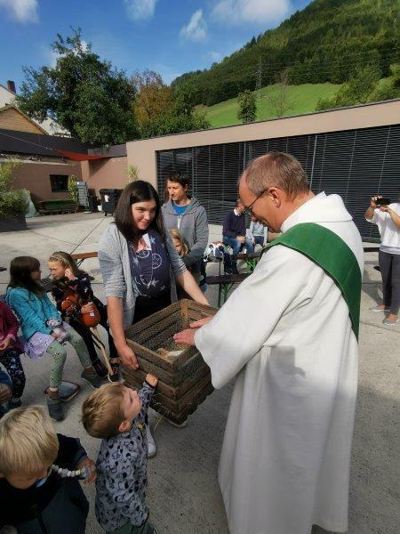 Der Innenhof füllte sich immer mehr mit Sonne und auch mit Feiergästen. Franz von Assisi, der am 4.10. seinen Gedenktag hat, war der Pate für die Feier. So wie er auf die Tiere acht gab, kann uns ein Beispiel sein. Dann sind uns die Tiere auch Freunde und Begleiter – oder auch die Kuscheltiere. Sie alle, Katzen, Hühner und unzählige Kuscheltiere, wurden am Ende des Gottesdienstes von Diakon Martin Rögner gesegnet.