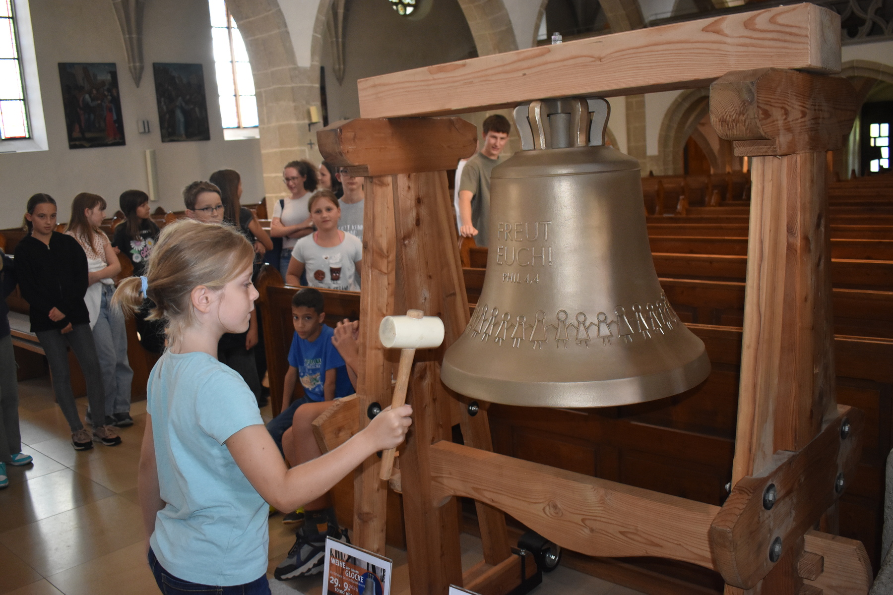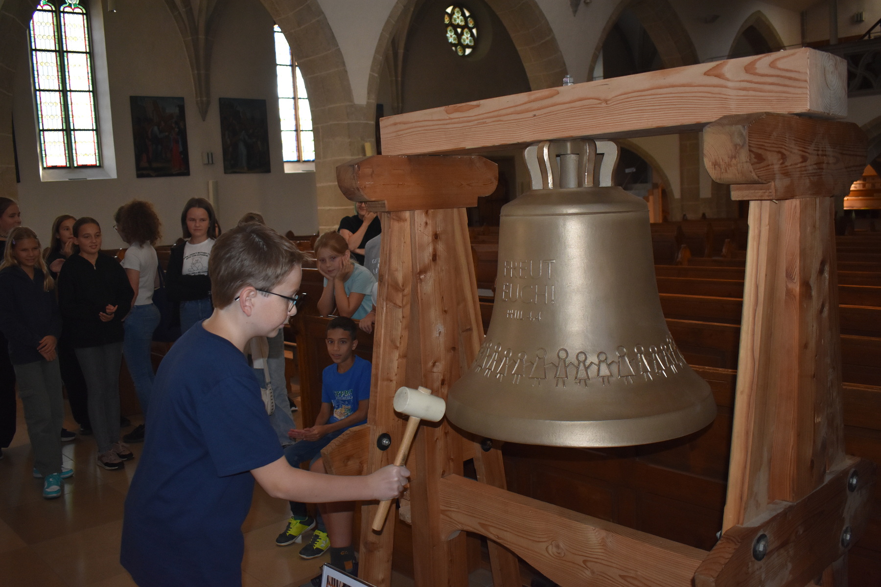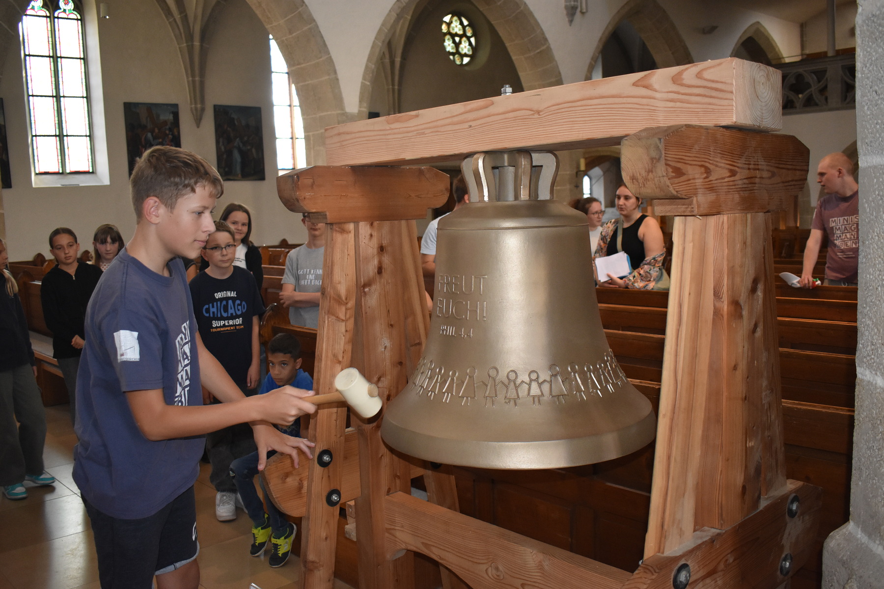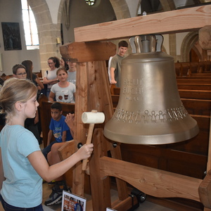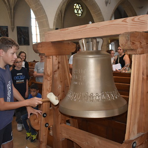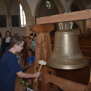Den heurigen Ministart begannen wir mit einer Besichtigung unserer neuen Kinderglocke, einige Mutige durften die Glocke mit einem Hammer sogar zum Klingen bringen. Dann ging es weiter mit einer Schnitzeljagd durch Gallneukirchen. Bei den verschiedenen Stationen lösten die Kinder Rechenrätsel, beantworteten Fragen zu Gallneukirchen und spielten verschiedene Spiele, wie "Stille Post" auf Papier oder "der Hase läuft über das Feld" mit einem Quietschhuhn. Zum Abschluss blickten wir mit einem Video noch einmal auf das letzte Minijahr zurück, dann blieb noch Zeit, um sich nach den langen Ferien wieder in den eigenen Minigruppen zusammenzufinden.