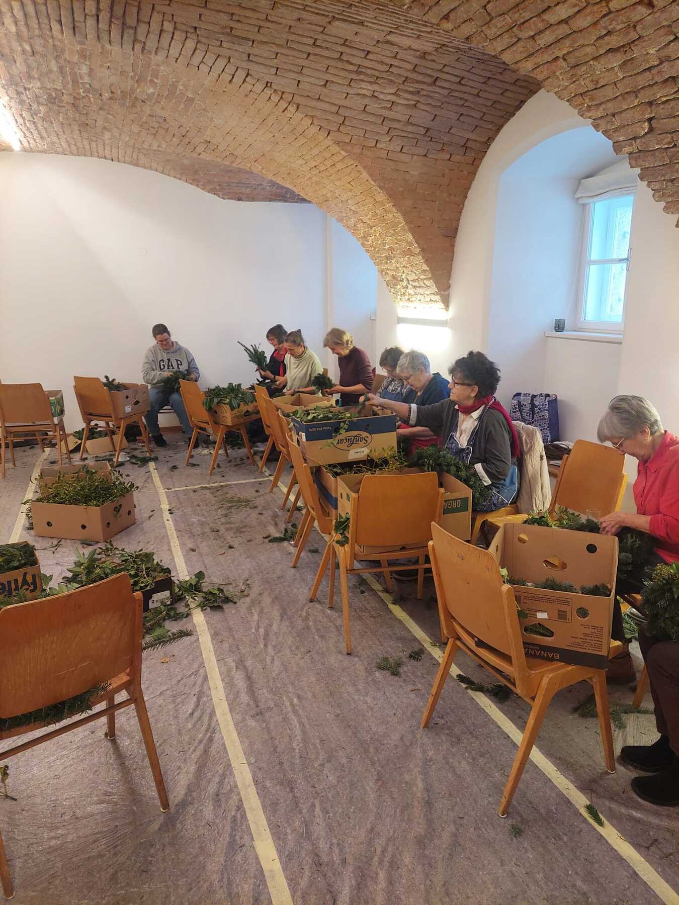 Im Pfarrzentrum St. Gallus wurde diese Woche fleißig gearbeitet: Der einladende Duft von Tannenreisig erfüllte die Räume, während zahlreiche engagierte Frauen und Männer gemeinsam rund 250 Adventkränze und Gestecke banden. Mit viel Sorgfalt, Kreativität und Gemeinschaftsgeist entstanden liebevoll gestaltete Stücke aus frischem Reisig, Ziergehölz und Misteln.