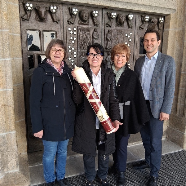 Wir danken der Goldhauben und Kopftuchgruppe Gallneukirchen für die Osterkerze, die – wie in den letzten Jahren – Gisela Gabauer verziert hat und den beiden Liturgieverantwortlichen des Seelsorgeteams Regina Eigner und Benjamin Hainbuchner übergeben wurde.