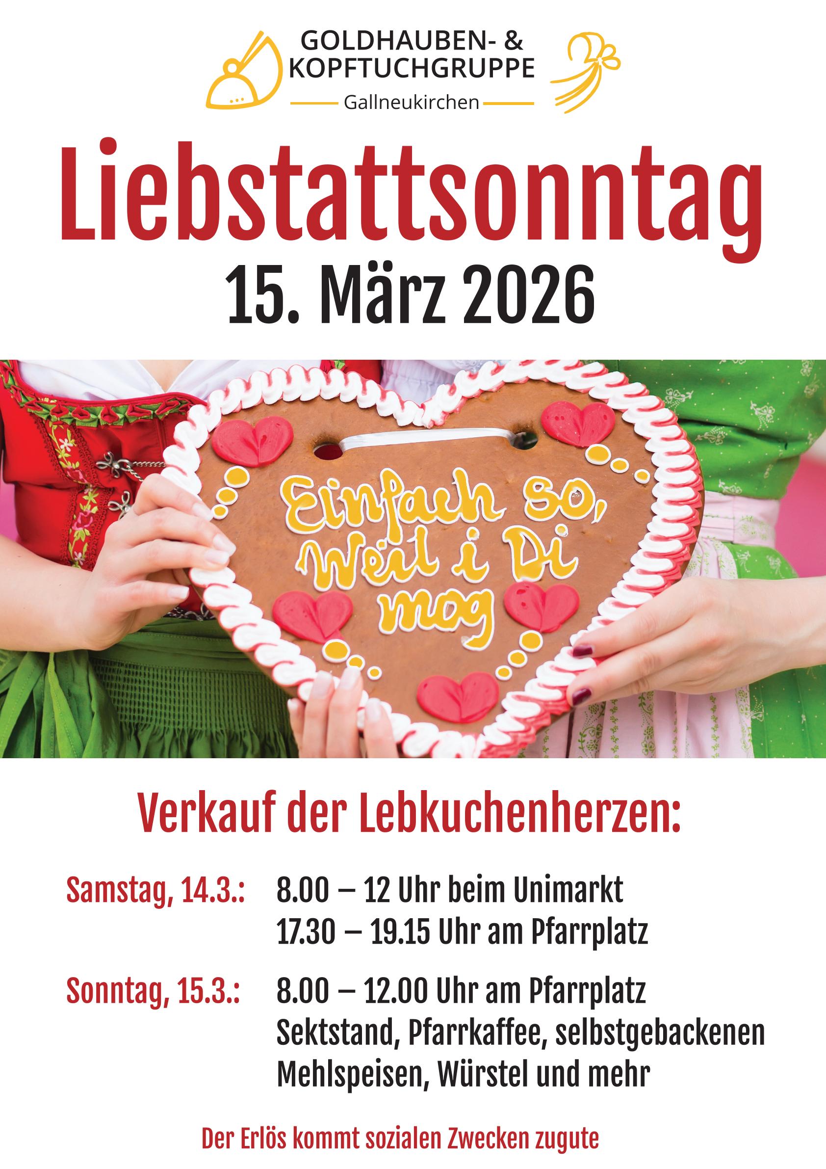 Verkauf von Lebkuchenherzen, Sektstand, Pfarrkaffee, selbstgebackene Mehlspeisen, Würstel und mehr