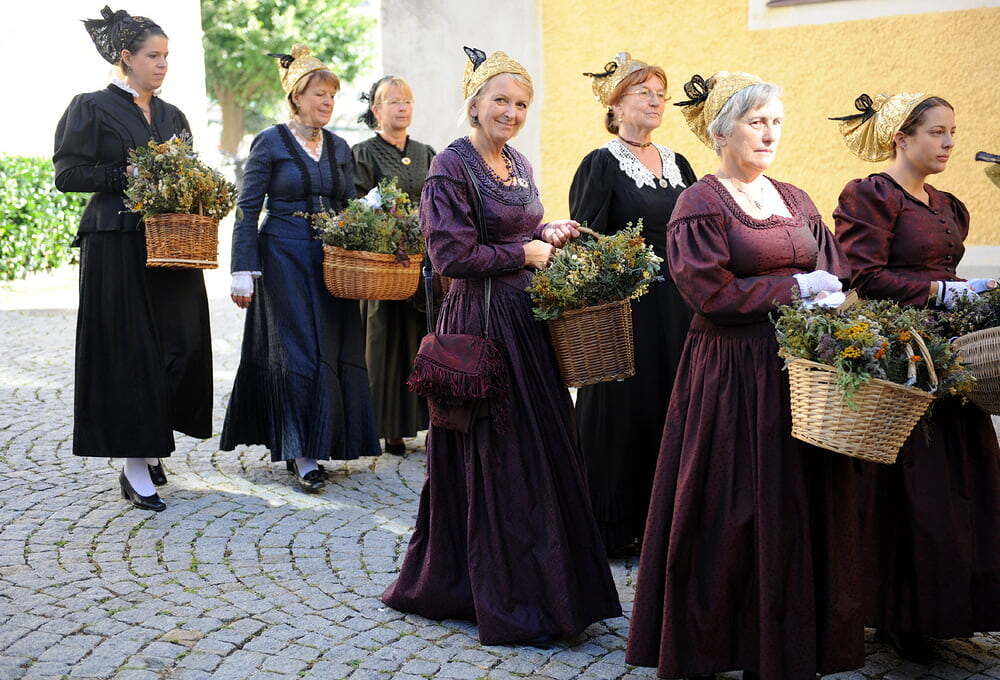 in der rund 700 jahren Alten Stadtpfarrkirche in Gmunden - immer am 15. August verkaufen die Goldhaubenfrauen Kr?uterbuschen - am Foto: Marlene und Eva