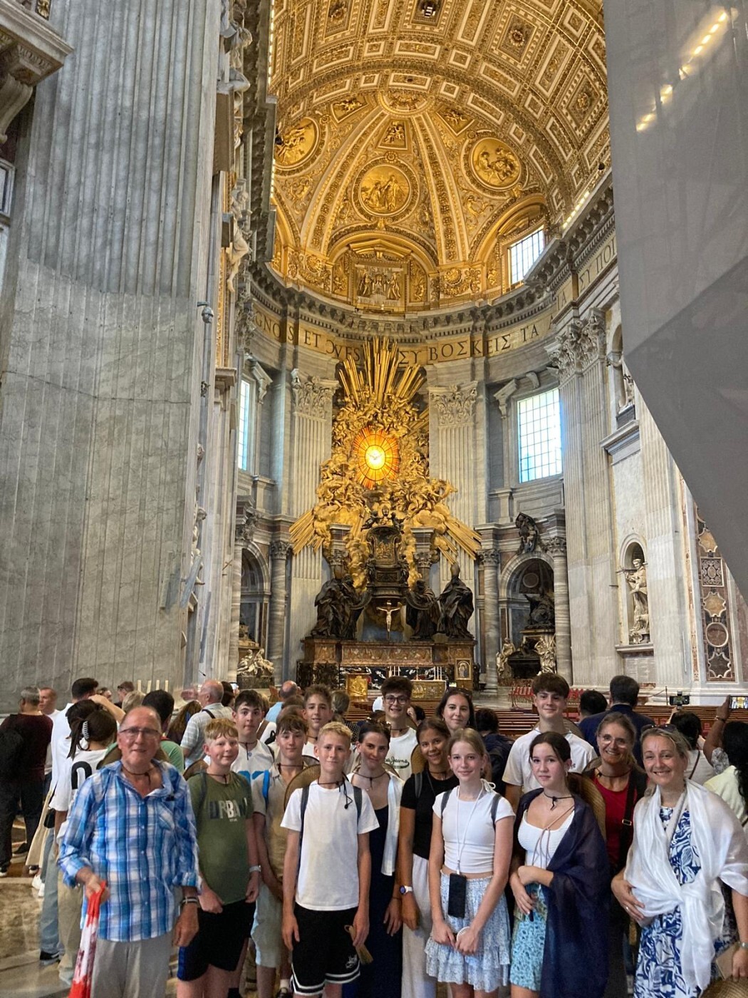 Unter dem Wallfahrtsmotto „Mit dir“ feierten wir am Mittwoch Vormittag mit 1300 Ministrant:innen aus Oberösterreich einen Gottesdienst mit Bischof Manfred Scheuer in der Kirche S. Maria degli Angeli e Martiri. Danach machten wir uns bei abermals großer Hitze auf die Spuren des antiken Roms und waren beeindruckt vom Kolosseum, besuchten das Forum Romanum und den Palatin. Im Hotelpool fanden wir am späten Nachmittag willkommene Abkühlung und am Abend saßen wir gemütlich zusammen und sangen gemeinsam mit den anderen Minis unserer Busgruppe (St. Gotthard, Ottensheim, Walding, Neußerling) Lieder aus dem Wallfahrtsbuch.