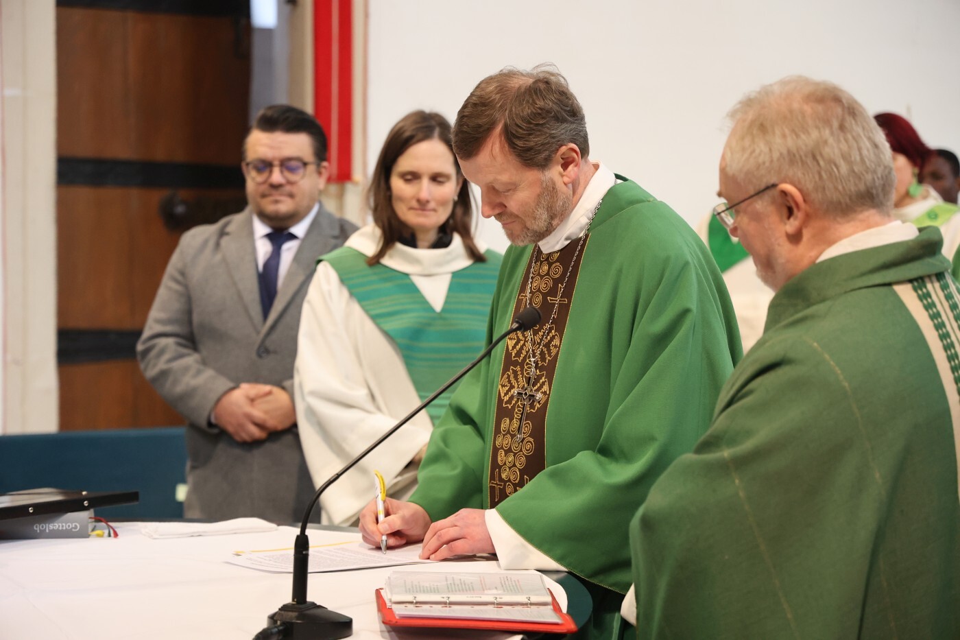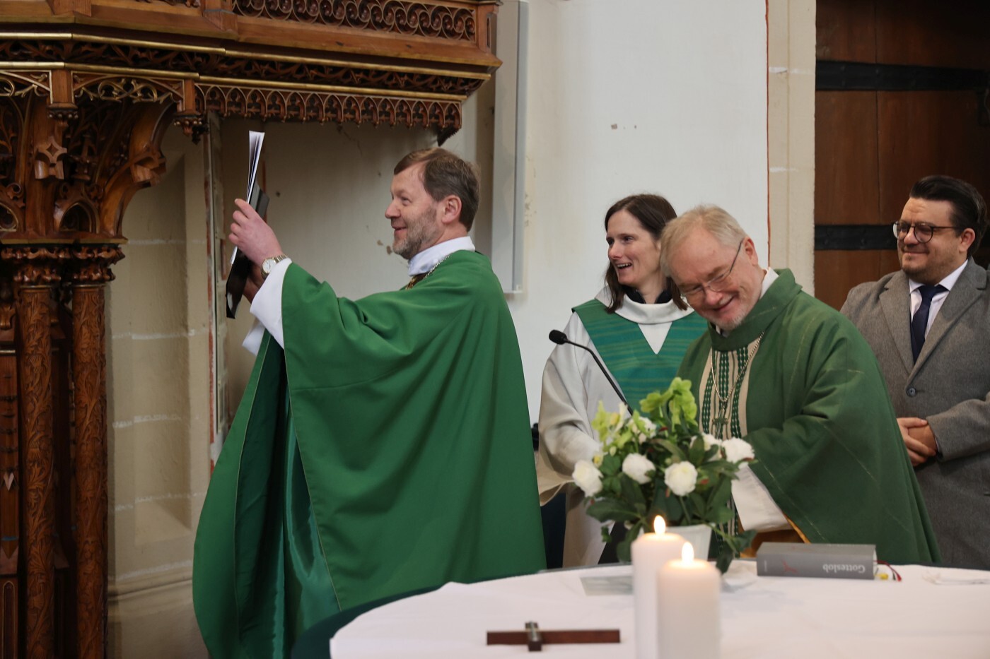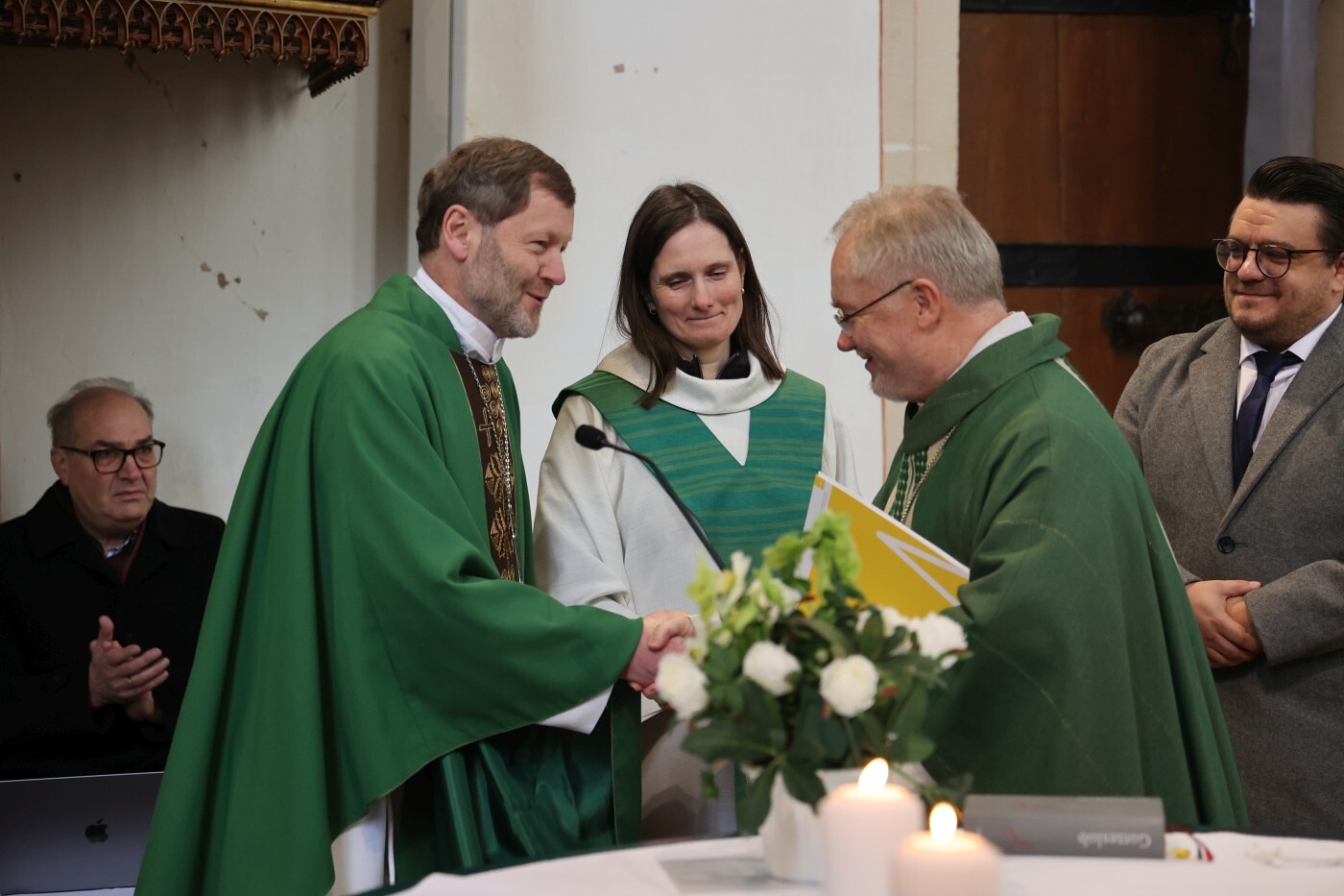Nach der Predigt beteten Pfarrer Abt Reinhold Dessl, Pastoralvorständin Maria Krone und Verwaltungsvorstand Daniel Himsl vor Generalvikar Lederhilger und der Feiergemeinde das Glaubensbekenntnis. Nun erklärte Generalvikar Lederhilger die Rechtmäßigkeit des Amtsantritts. Vertreter:innen der Pfarrgemeinden und pastoralen Orte drückten dem Pfarrer und den beiden Pfarrvorständ:innen per Handschlag ihre Verbundenheit und ihre Bereitschaft zur Zusammenarbeit zum Wohl der ganzen Pfarre aus. Abschließend segnete Generalvikar Lederhilger die Neubestellten für ihren Dienst.