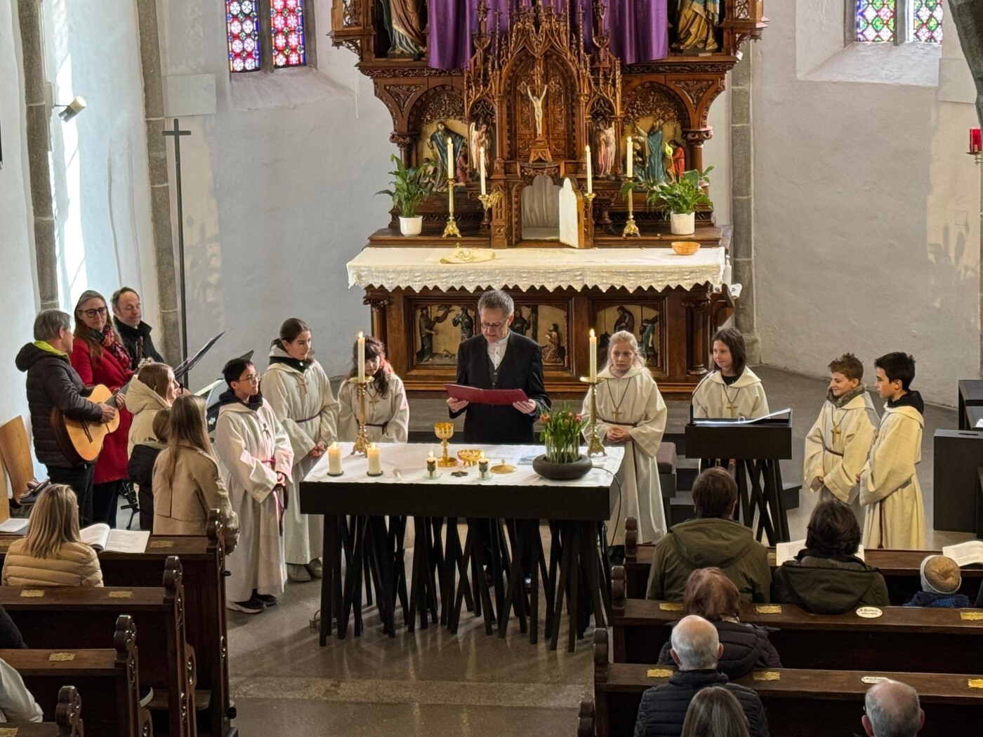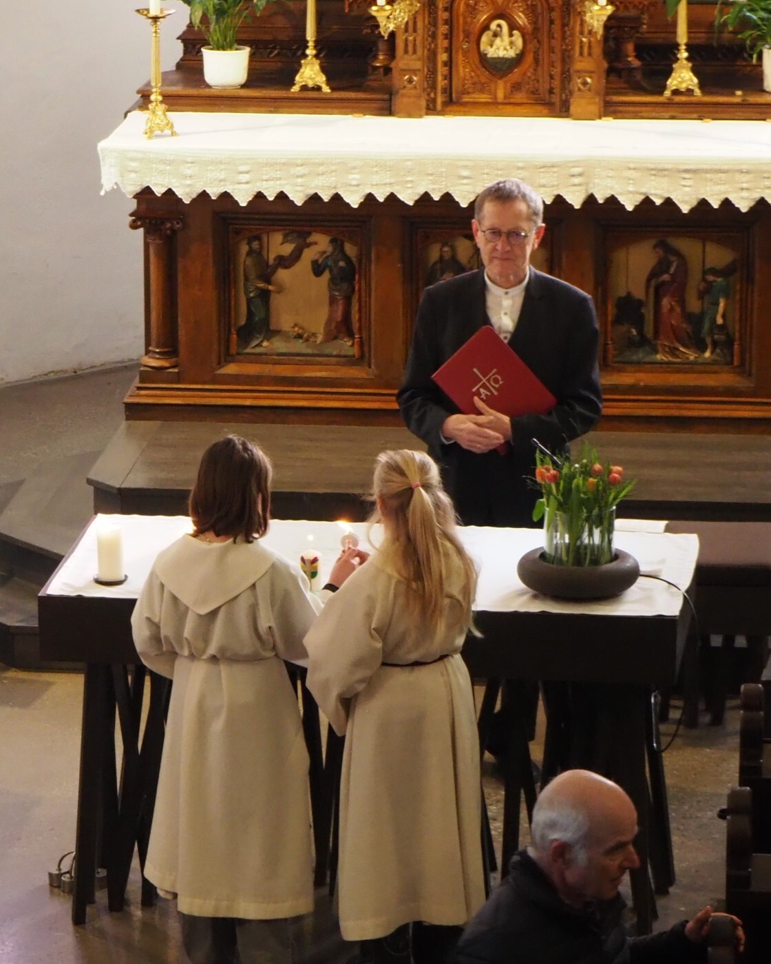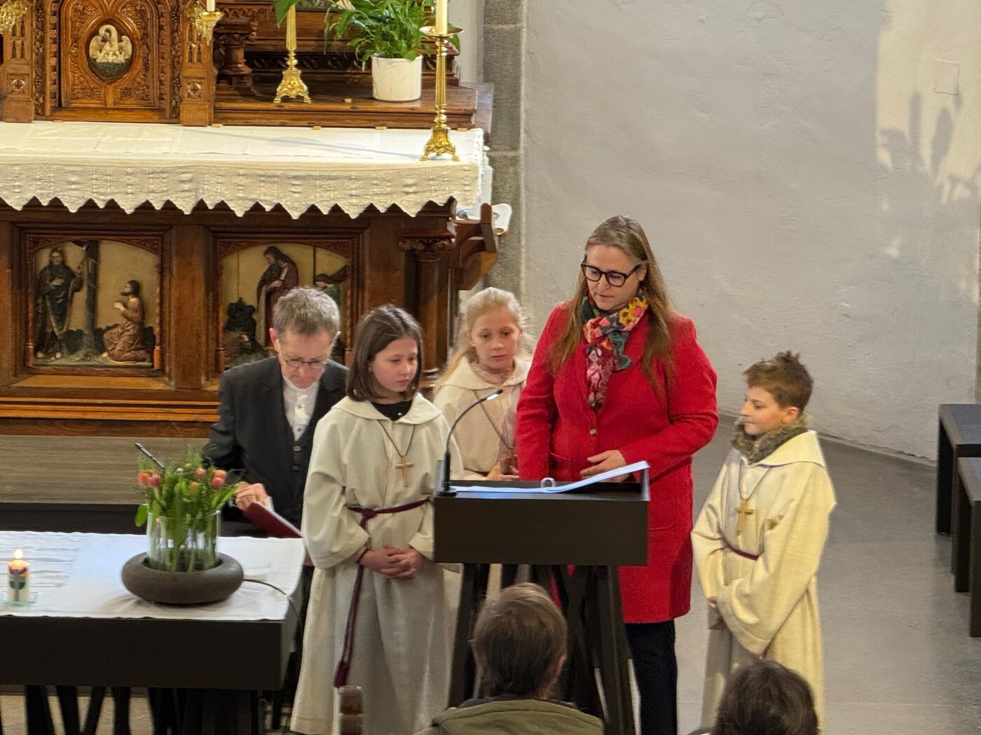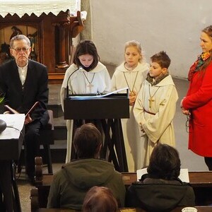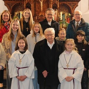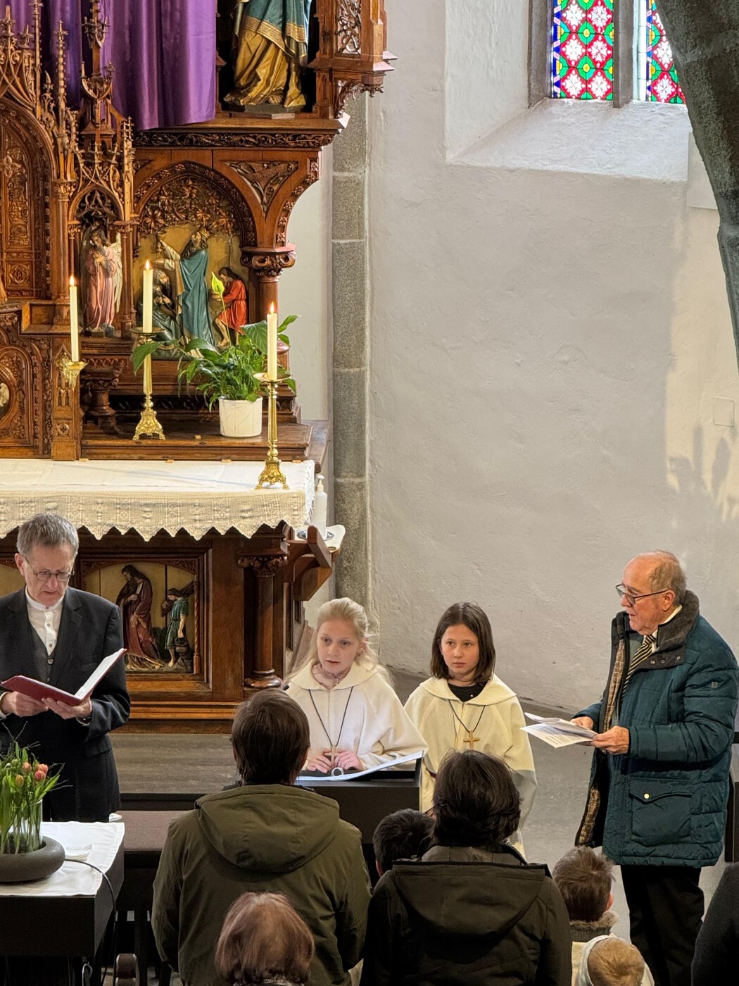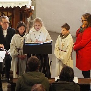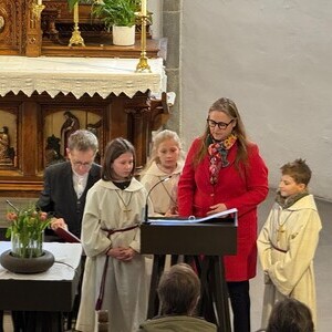 Im weiteren Verlauf des Gottesdienstes wurden Emma und Theresa offiziell in ihren Dienst aufgenommen und sprachen gemeinsam das Ministrantengebet. In den Fürbitten wurde darum gebetet, dass Gottes Licht Menschen begleitet, besonders jene, die einsam, traurig oder krank sind, und dass auch die Ministrantinnen und Ministranten ihren Dienst mit Freude erfüllen können.