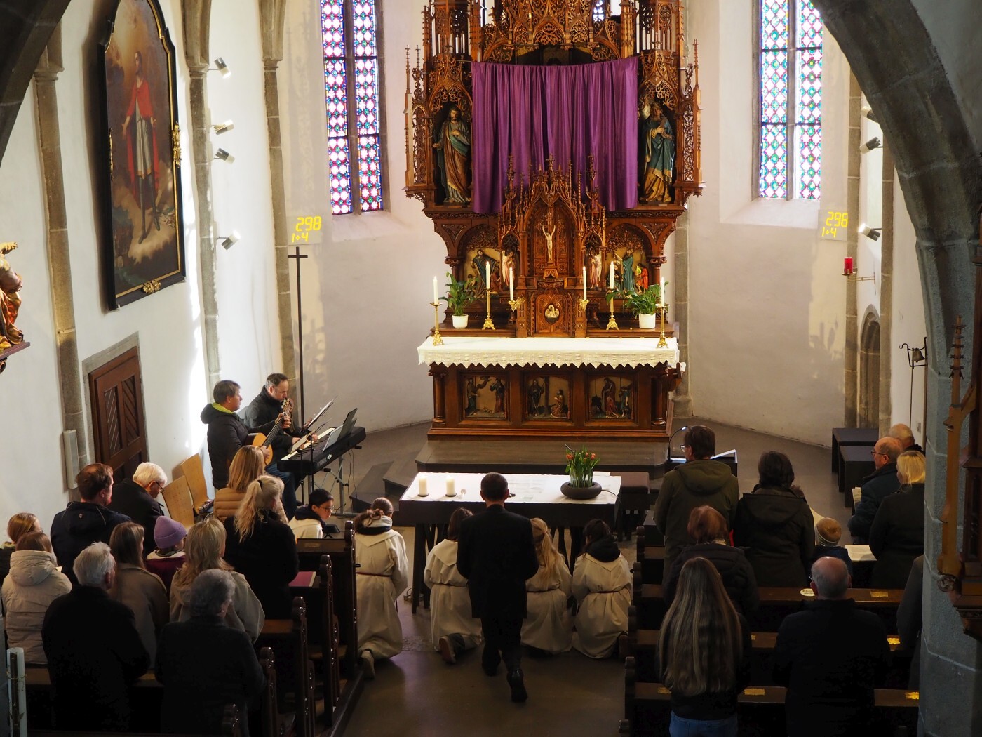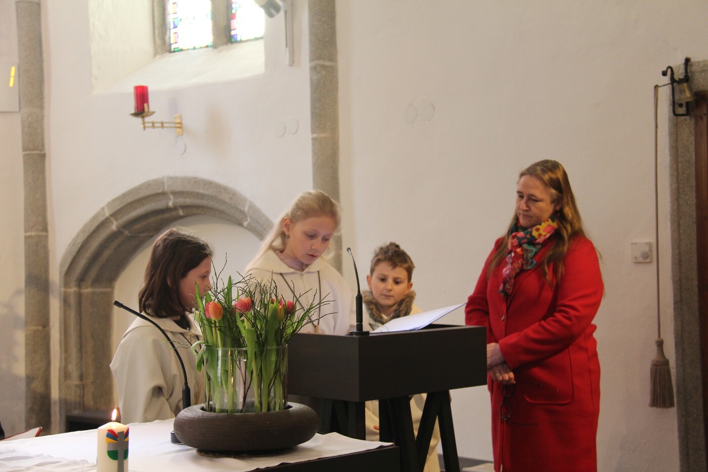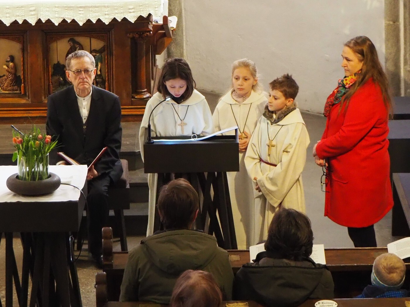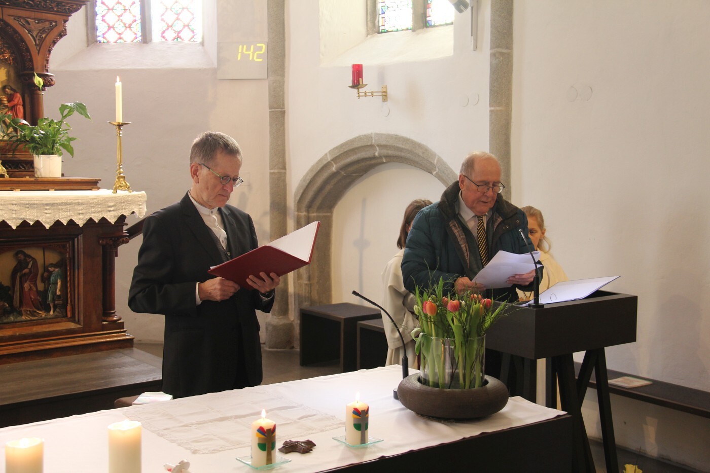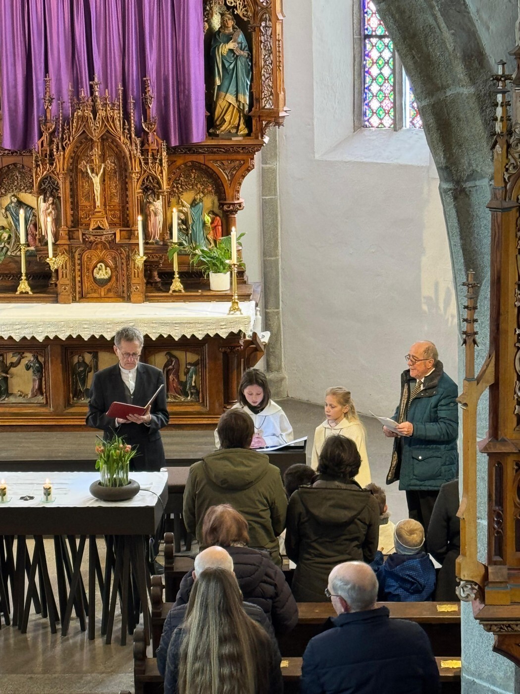 Im weiteren Verlauf des Gottesdienstes wurden Emma und Theresa offiziell in ihren Dienst aufgenommen und sprachen gemeinsam das Ministrantengebet. In den Fürbitten wurde darum gebetet, dass Gottes Licht Menschen begleitet, besonders jene, die einsam, traurig oder krank sind, und dass auch die Ministrantinnen und Ministranten ihren Dienst mit Freude erfüllen können.
