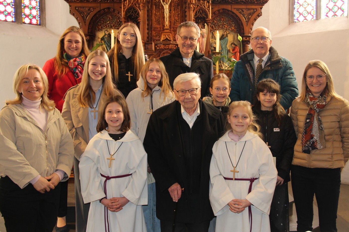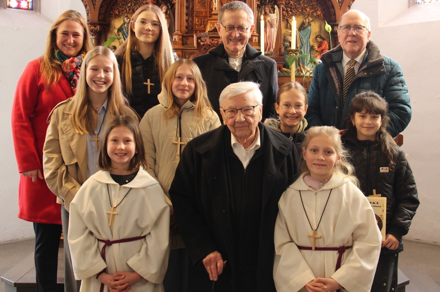 Ein weiterer wichtiger Teil des Gottesdienstes war der Dank. Mehrere Ministrantinnen beendeten nach vielen Jahren ihren Dienst. Ihnen wurde für ihr Engagement gedankt – für ihre Zeit am Altar, für gemeinsame Aktionen wie Sternsingen, Ratschen oder das Verteilen des Friedenslichts und für ihr Vorbild für die Jüngeren. Als Zeichen der Anerkennung erhielten sie ein Ministrantenkreuz und eine Urkunde.